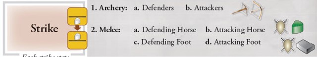 While this is the regular sequence, with SUDDEN CLASH Events played in this Battle, Colle’s Defending Horse and Giordano’s Attacking Horse each Strike before any Archery. This Battle’s Round 1 will follow the sequence:
