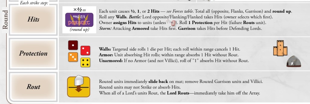 For Each strike step, we look at the “Forces” chart and apply the Hits to the Enemy units, taking into account the different Capability cards of each Lord.
