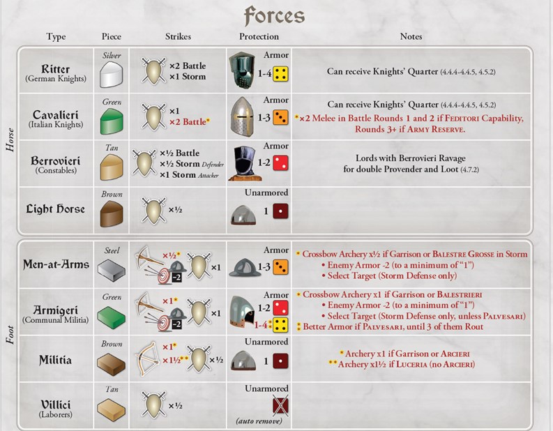 For example, we see on the Forces chart that Cavalieri units (green wedges) yield 1 Melee Hit each, Berrovieri (tan wedges) ½ Hit each (in Battle), and Light Horse (brown wedges) each ½ Hit also.
