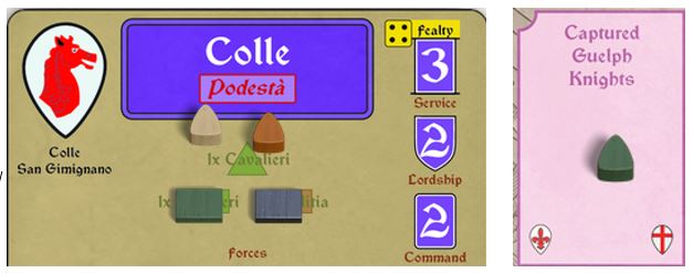 At the end of the turn, some Unbesieged Guelph Lord will need to pay a Coin from his mat to the Ghibellines to liberate that Captured unit back onto a Guelph Lord’s mat. Failure to do so leaves the Cavalieri to Languish in Captivity, resulting in anger from the population that either triggers a Revolt Roll or awards 1 Treachery card to the Enemy (Ghibellines’ choice).