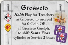 My Guelphs during Turn 3’s Event draw step have drawn the GROSSETO Hold Event, which allows for a Treachery at that Town to succeed automatically for 0 Coin. So, my goal is eventually to use that card at Grosseto (bottom left of the map).