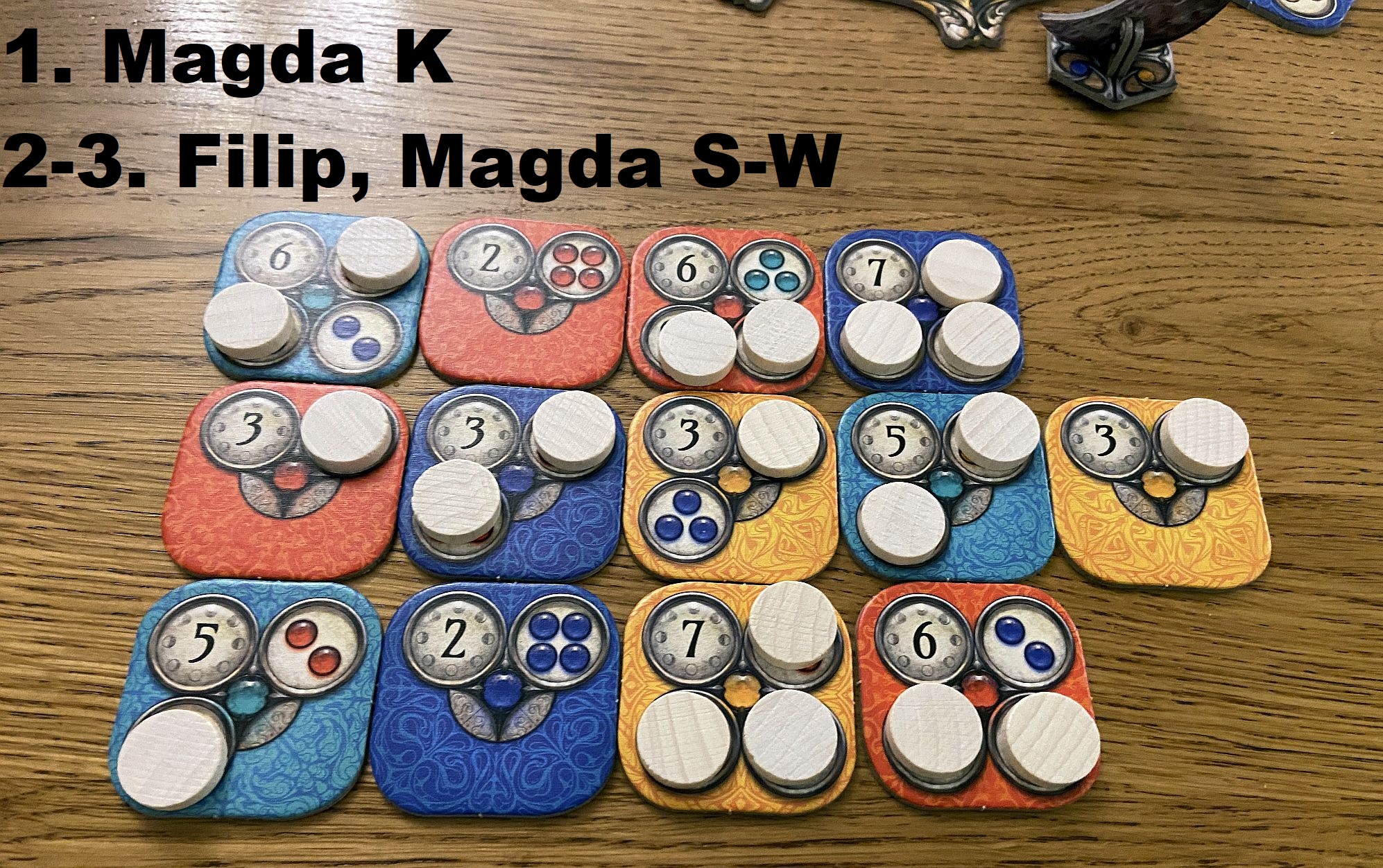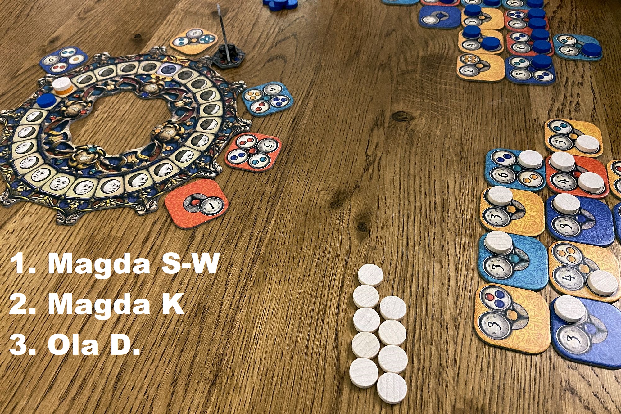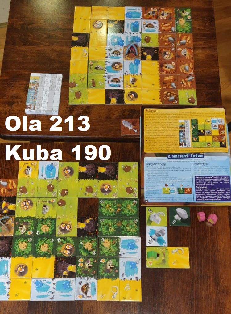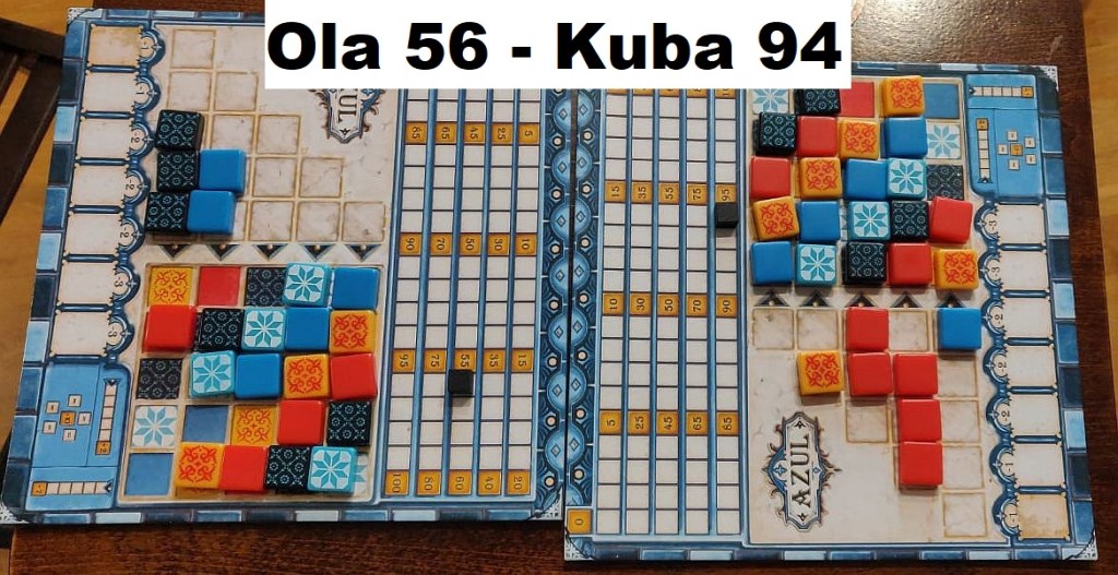 Co do samych gier to najpierw Kuba wygrał w nieśmiertelnego Azula, aby potem częściowo zrekompensować to Oli w Kingdomino. Tej drugiej gry jeszcze nie znam, natomiast wygląda miło i przyjemnie jako szybki, krótki wymóżdżacz 🙂