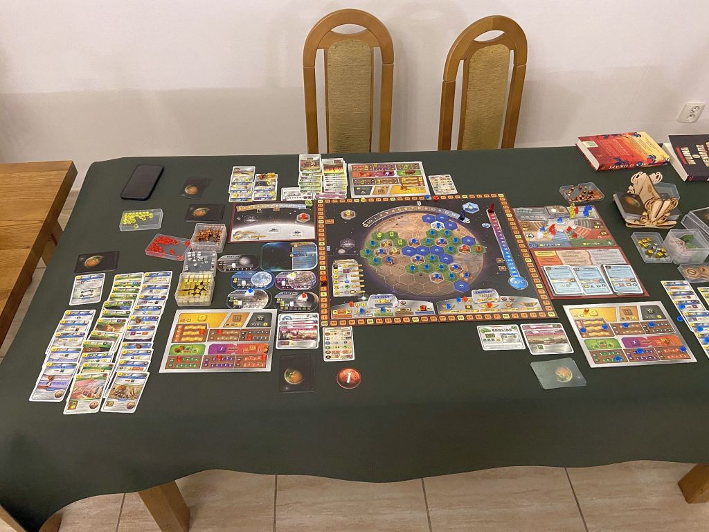 Pora na pierwszą, główną pozycję wieczoru – Terraformację Marsa. Chciałbym najpierw zwrócić uwagę na zdjęcie po lewej – przygotowanie do rozgrywki, dodatkowe komponenty, super sukno na stół – klimat był niesamowity! Oczywiście, chwilę zajęło zeksplorowanie całego Marsa plus większości dodatków – ostatecznie w tej epokowej podróży zwyciężył Filip. Gratulacje!