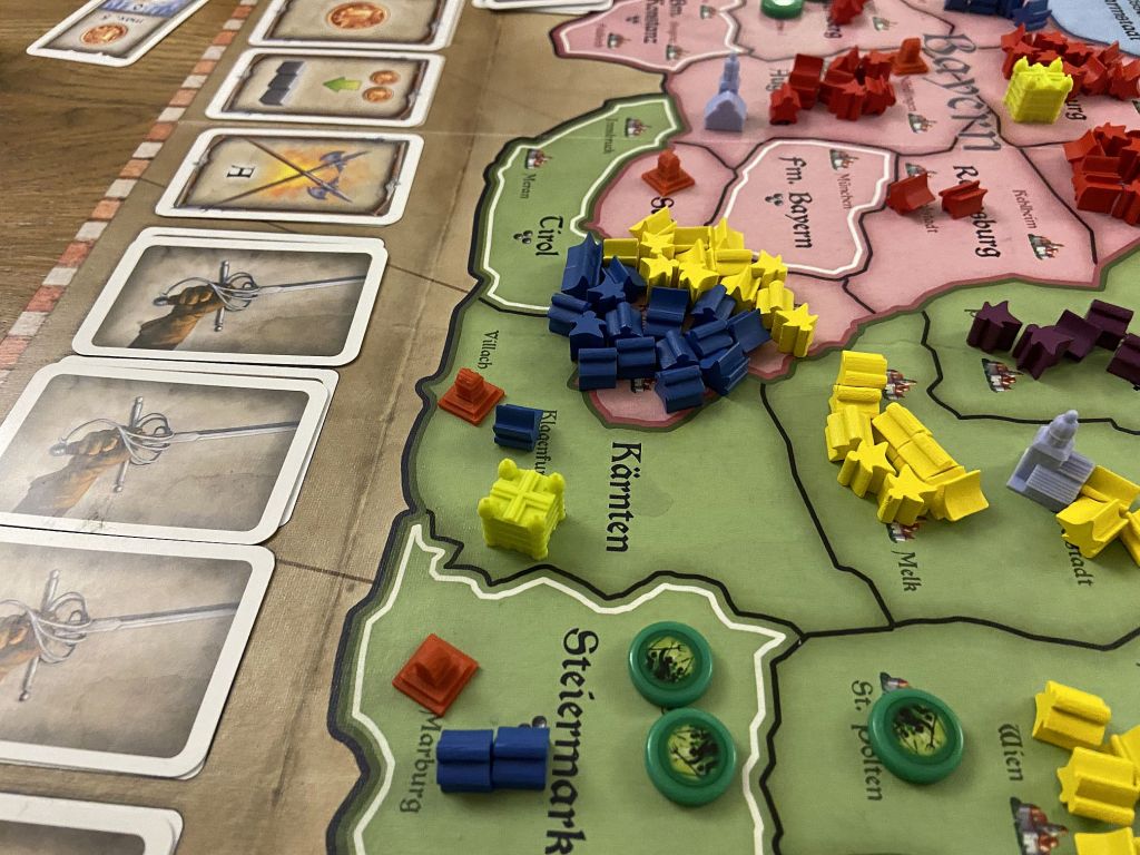 Dorota i Kuba dołączyli do nas wczoraj około 18, ale już chwilę po rozpakowaniu się i uporaniu z obiadem zasiedli do pierwszej planszówki. Umówieni byliśmy na Wallensteina (dla chętnych, więcej o tej grze w tej relacji) i cicho liczyliśmy, że dołącza do nas nowy adepci 🙂 Tak też się stało.