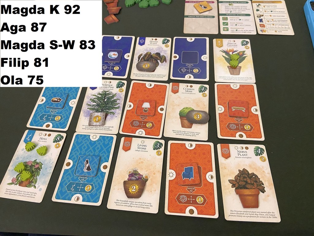 Tzw. rozchodniaczek planszowy, Verdant, ukoronował wczorajszy wieczór. W tej szybkiej, miłej i przyjemnej partii – z całkiem wyrównanymi wynikami – zwycięstwo odniosła Magda K – kolejne tego wieczoru! Gratulacje!