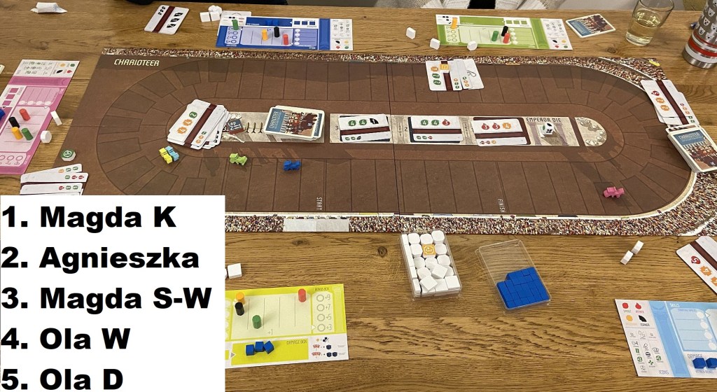 Wyścigi rydwanów ewidentnie przypadły do gustu uczestnikom wyjazdu. Tym razem zainicjowała to młoda adeptka, Ola, którą mieliśmy okazję wtajemniczyć do gry ostatnio. I tym razem w celu lekkiego zaoszczędzenia czasu jechane były dwa kółka – w których doświadczeniem zwyciężyła Magda K. Cały czas myślę, że im więcej osób przy planszy w ten tytuł, tym lepiej dla rozrywki. Będziemy kontynuować!