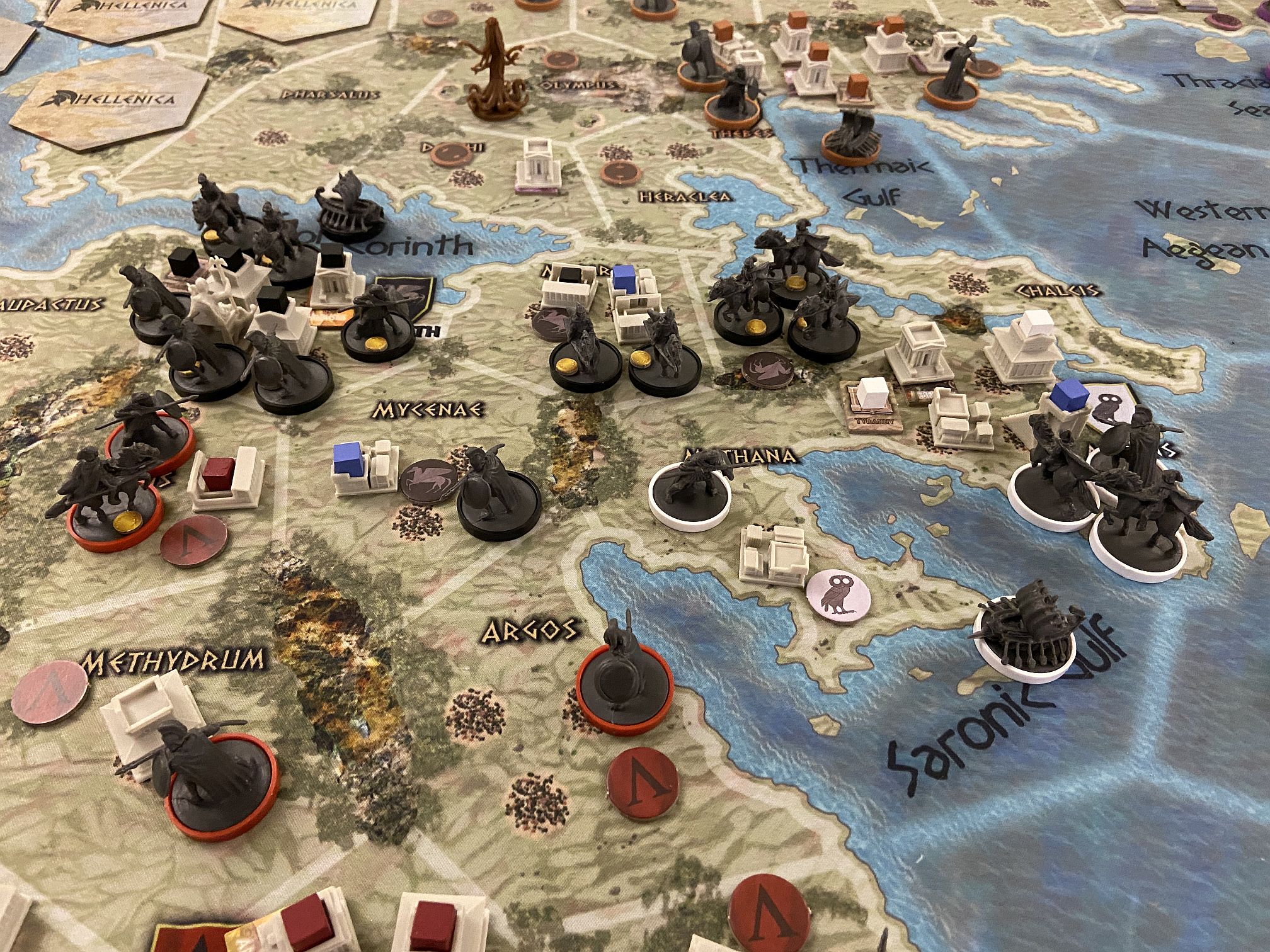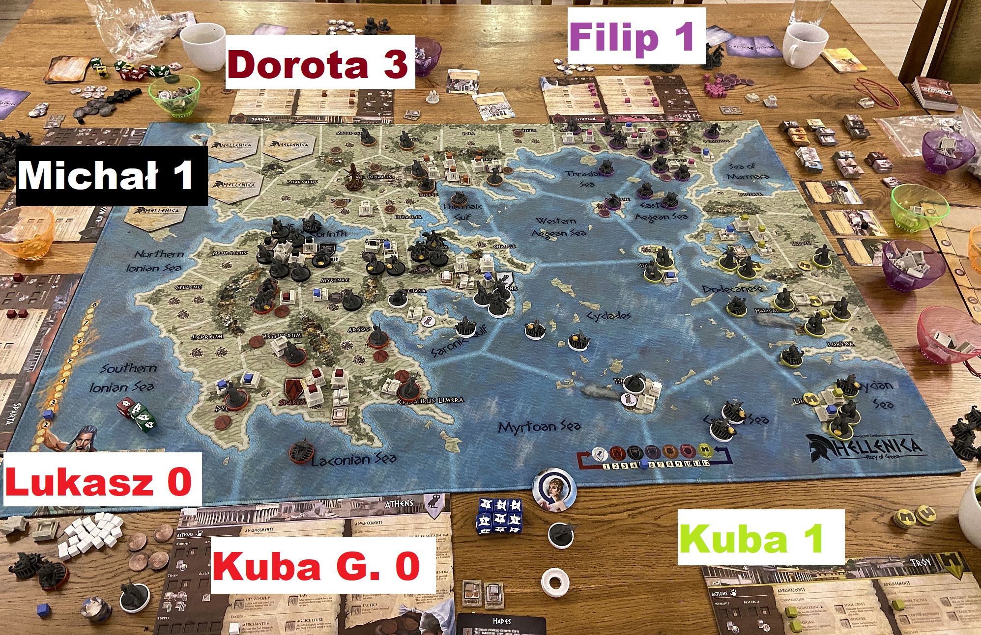 Hellenica to – z wielu powodów – zdecydowanie gra wieczoru. Czas rozkładania, czas tłumaczenia zasad, zajmowana powierzchnia – to wszystko było naj. Czy było coś jeszcze? Tak, najbardziej zaskakujący rezultat – grono wytrwanych graczy gier wojennych zostało ograne prze Dorotę! Gratulacje! Na pewno powstanie szczegółowy opis tej rozgrywki.