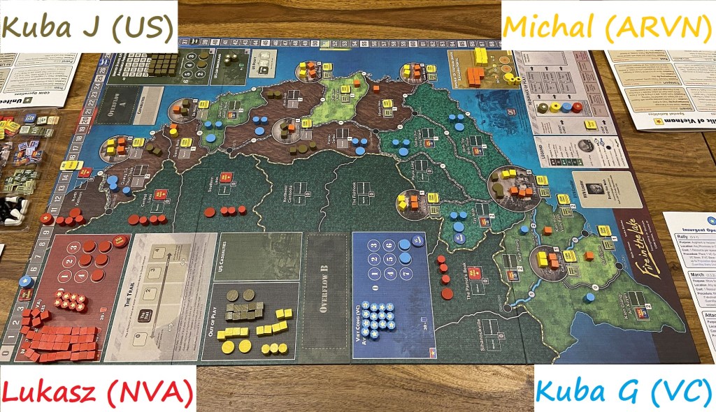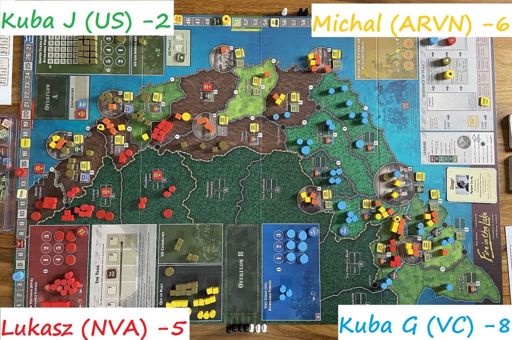 That was a true blast. I admit, Fire in the Lake is definitely one of the more complex COIN games; still, that not prevented guys from quickly grasping the game mechanics and having a lot of fun from it; we managed to surprise each other with some clever moves, we learned strengths – as well weaknesses – of our forces, and we truly immersed into the Vietnam War theme.