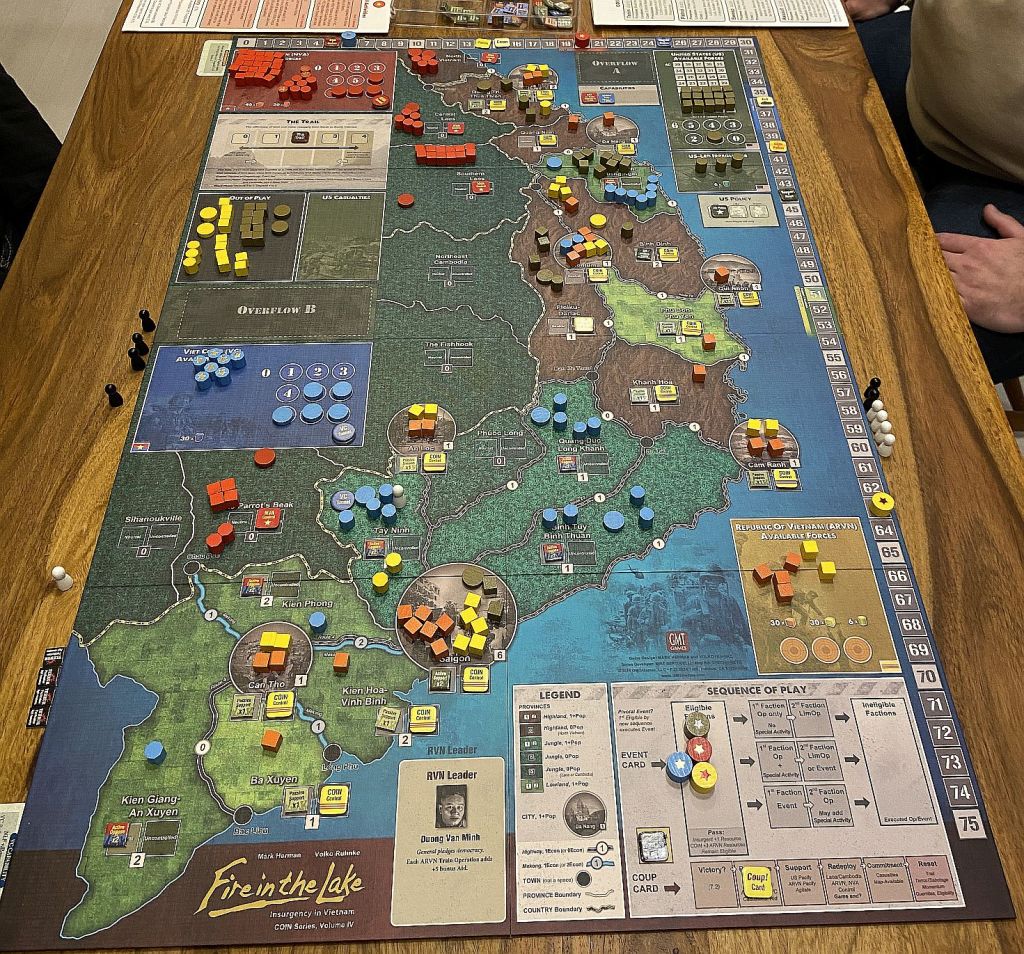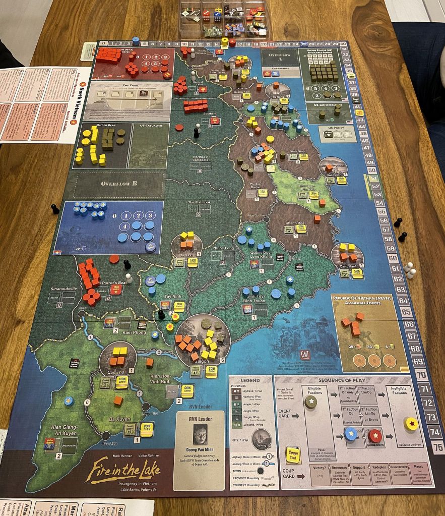 Fire in the Lake is Volume IV in the COIN Series of games that use similar rules to cover (usually) modern Insurgencies and other inter-factional conflicts. This is a 1- to 4-player board game depicting insurgent and counter-insurgent (COIN) conflict during the main US period in Vietnam, 1964-1972, up to the “Paris Peace” – actually, expansions allow to follow the events after that period (Fall of Saigon) or prior to it (Sovereign of Discord).