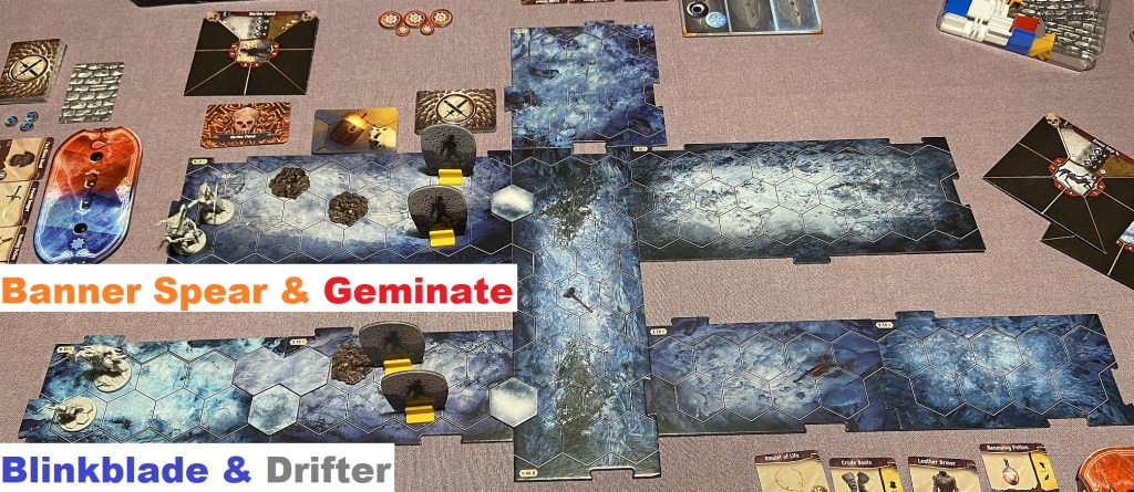 BoardGameGeek forum mentions “bad” scenarios, and that one is among one of the worst, the Fiend Shrieks are hated enemy. After turn 2 or 3 most of us has been brought to 1 HP, but if we didn’t take those hits, the bridge would get damaged and probably destroyed causing our failure. We were fairly lucky, that only in the first turns when we opened new rooms scenario got hit and never with a crit/double damage. I saw people getting Shrieks hit the bridge/scenario with crits and after the first it was basically a sure loss. We played smart, quick, had a good division of teams, my pairing with the Geminate was perfect, i used my new lvl 2 card – the Meatgrinder 3 times(strong attack against 2 targets requiring placing monsters between me and an ally- which isn’t easy to prepare) and it helped clearing enemies quick. Guys in the bottom route had bit more problems, but Blinkblade’s trademark move(deal 1-2 dmg within range 2) and Drifter’s aerial attack Destructive Fury with shocwave did quite a massive damage, so our help(my Bannerspear’s and Geminate’s) wasn’t required. All but just 1 (i think ) loot tokens have been collected, so we have tons of materials, but will they suffice for long, we’ll see 😉