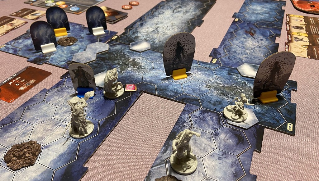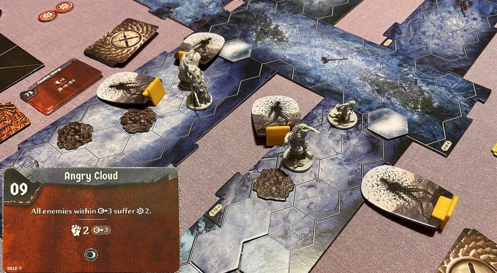 This one didn’t cause us too many problems re the bridge being destroyed (we thought it was a frozen giant skeleton from looking at the scenario sticker on the map) but think we were lucky with enemy card draws when we opened doors on this one . There is a later scenario we encountered later on (#67) which is similarly brutal and attracting some threads comparing it to the dreaded Oozing Grove. That was very tough and took us multiple tries.