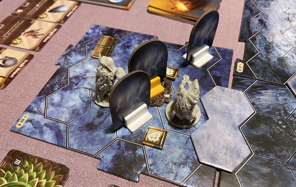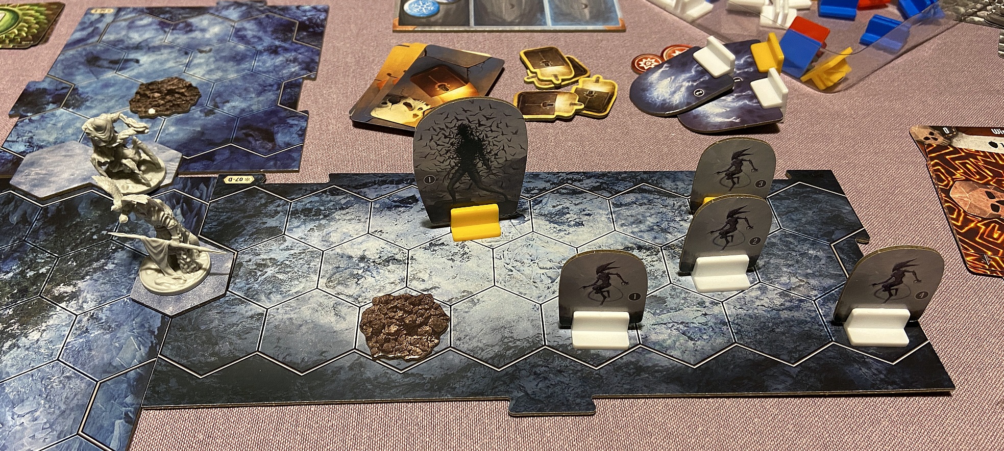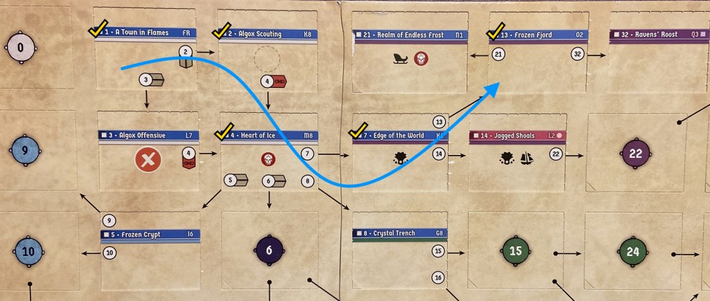 Now, as for our campaign, just a reminder that we follow the Lurkers campaign path. We decided we would like to know more about those creatures. After playing first installment in this story branch (#7 Edge of the World) we could make a decision whether to build a boat and follow-up via sea or choose the path along the coast instead. As we opted to spend resources for other needs, we knew we will need to enter the #13 Frozen Fjord.