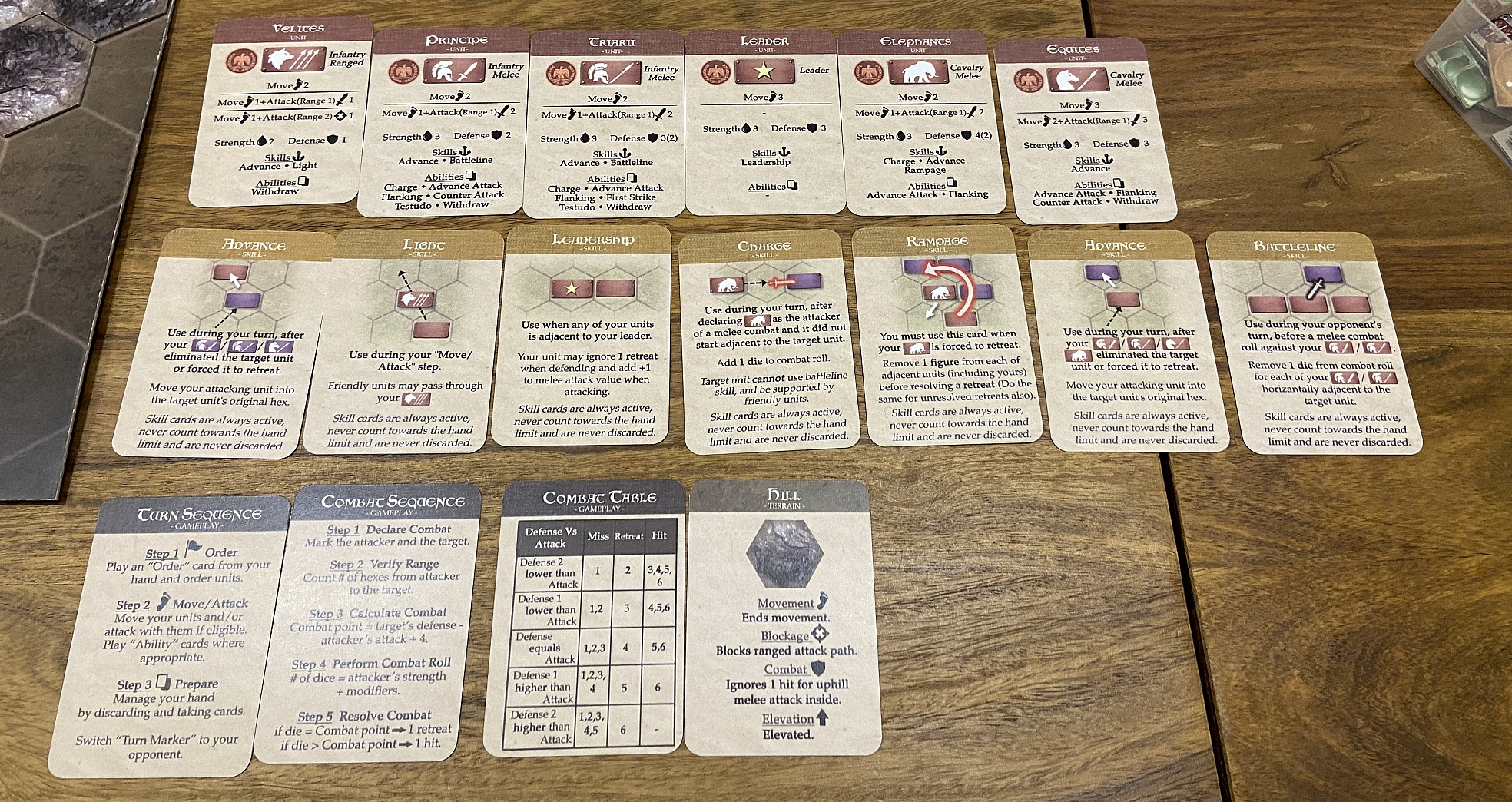 Faction cards lie at the heart of the game. They are kept secret and played to order units (green), activate their offensive (red)–defensive (blue) abilities, or start an event. Each faction has its own unique set and the content is changing from one scenario to another. Order cards allow you to position your units strategically across the battlefield to best coordinate your attacks, while ability & event cards empower you to apply some combat tactics such as charging, flanking, envelopment, phalanx, testudo, and withdraw. There is also a scenario card in each deck which takes the place of a key event happened in that battle. For example, the surprising pass of Romans through a secret path in Aous Battle (198 BC) is simulated by an order card which upgrades their movement up to 5 hexes.