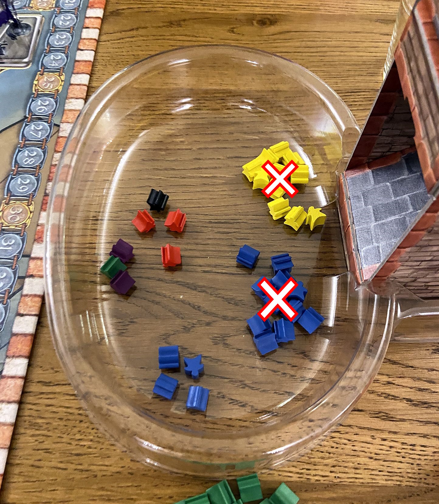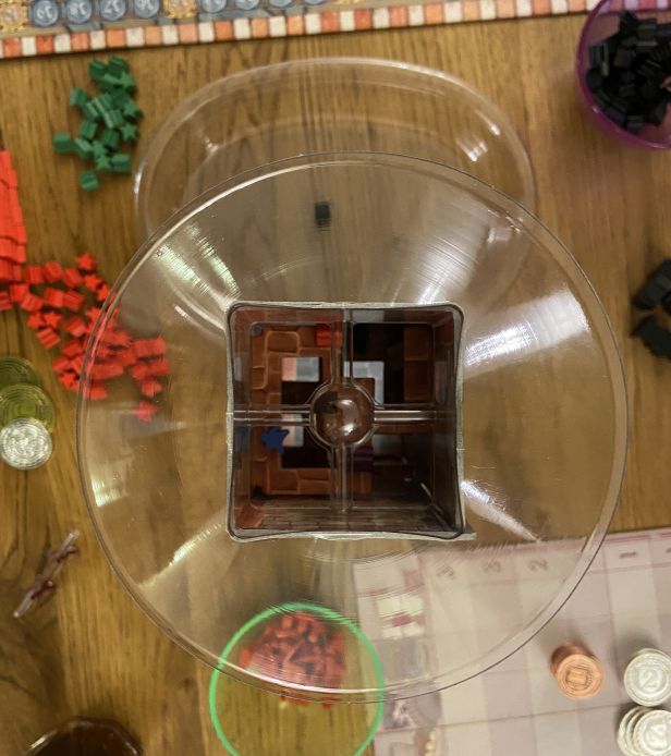Combat and revolts are handled via a dice tower in which players drop army units and peasants (colored wooden cubes) into the top of the tower and see which ones emerge in the bottom tray (representing the fighting forces for that combat) and which get stuck in the tower’s baffles to possibly emerge in the future.