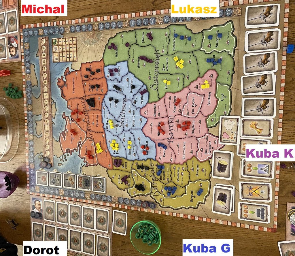 For our initial game we managed to gather group of 5 players. We played with most of expansions as it definitely adds flavor to the game. For Kuba K and Dorota – who arrived at our convention just before the game – it was a debut with Wallenstein. Let us see how it went for them and other players!