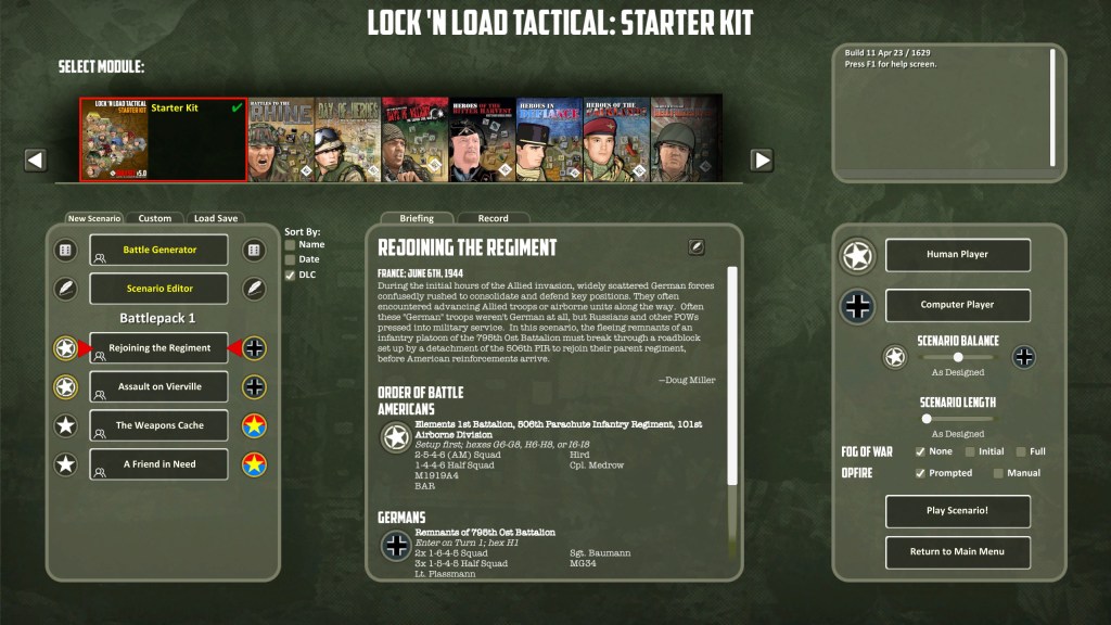 The screen for the new game is very intuitive – at the top you have all the purchased / available modules and you choose one. As you can see above, Starter Kit allows for play of 4 pre-defined scenarios, but also Random Battle. You can choose human / AI Player for each side, Scenario balance, Fog of War and Opportunity Fire modes. Cool!