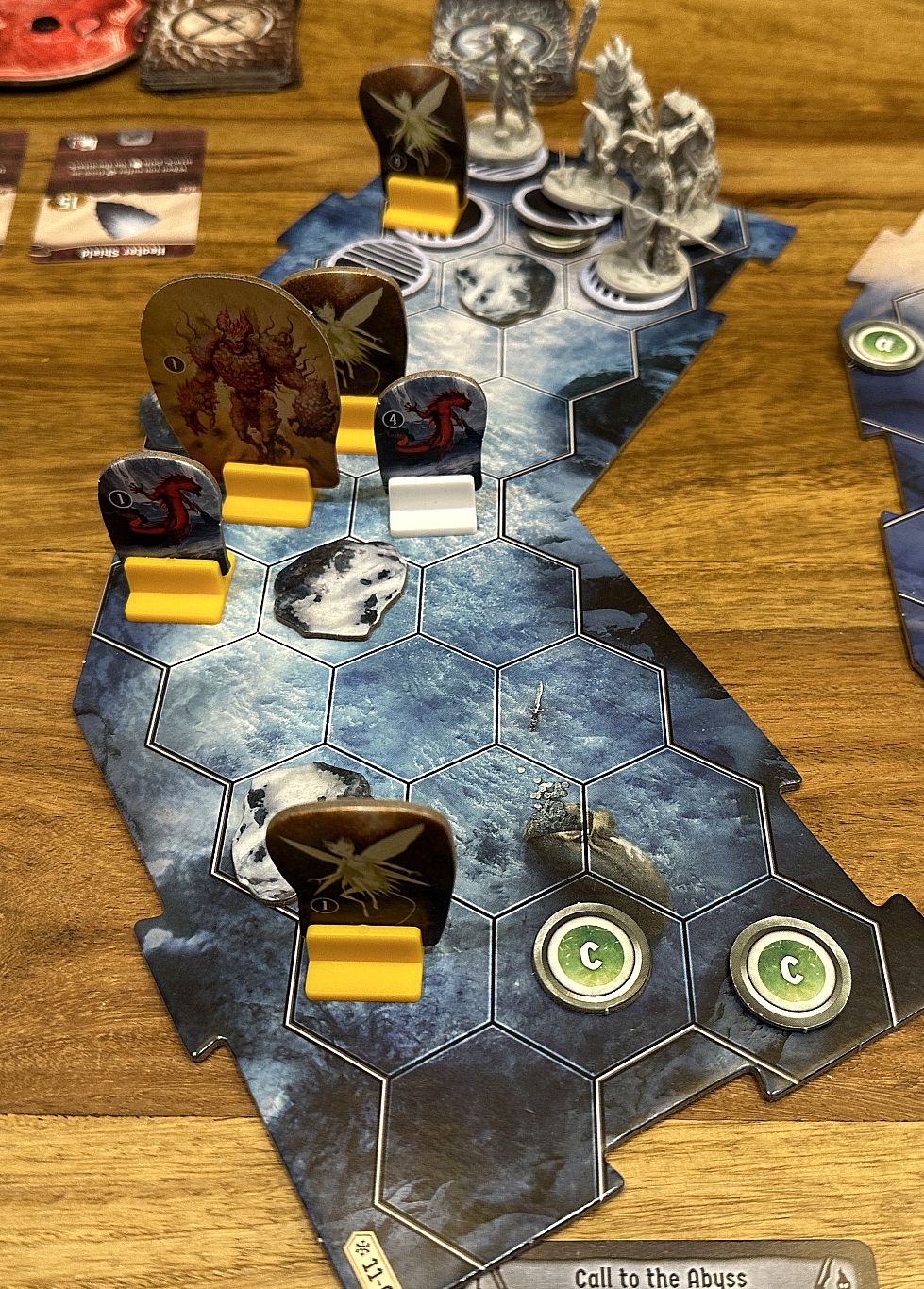 Little late comment as for me, sorry for those millions fans reading that 😉 Very lucky scenario for us. In the first round rending drakes didn’t move, so we avoided being locked down by enemies, we could spread a little, create room for ourselves , add some crowd control, and slowly killed all enemies. As usually my Bannerspear got hit many times and health became a little issue, so i wasn’t eager to move fast to another location, it took us some 2-3 turns to regroup, rest, loot and heal up before we moved to the 2nd location which was even more crowded than the first one. In general it’s bad when there are so many enemies, but forest imps don’t always attack and strong hitters(drake or earth golem) didn’t have much room to act. Killing enemies while having tons of curses in your deck isn’t easy, but at this point forest imps were a way more pleasant enemy than ice imps(they apply a nasty brittle), their base attack is low, so we can easily surivive few attacks in one round. We quickly reached a point where enemies couldn’t give us more curses(deck of 10 quickly got spread between all of us, and from time to time we released 1-2 curses to make them available again). Frosthaven scenarios are often way more crowded than in Gloomhaven, we run of cards quick, despite playing few burners. Luckilly we picked a good route, the final location was maybe the longest, but also seemed least crowded, and we didn’t need to move far. We killed closesest enemies and far away ones had to get to us first, giving us 1-2 turns on not having all enemies attacking us. At the end we even had quite a few rounds for ourselves(scenario ends when we loot the soils sample), so as long as we didn’t loot it, we could play cards for experience. Such crowded games are perfect for my Bannerspear, i have never earned 16 exp from ability cards before. After we finished, and returned to town and i retired my character. Our group will be having a very difficult times soon, we will have just one tanky character and 3 squishy ones(Geminate has high level, and little extra HP, so will e our secondary tank). Meeting enemies with multi attacks, especially ranged ones will be very dangerous, but we’ll see. I’ve decided to take the trap, seems like a solid support, that can do a very solid damage, if needed (and used properly-allowed to play for himself as well).