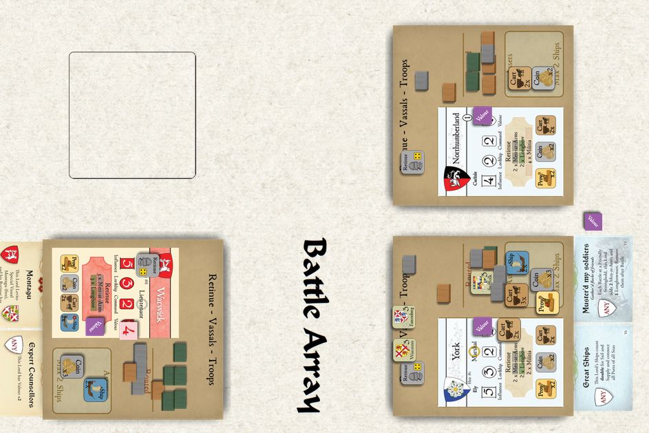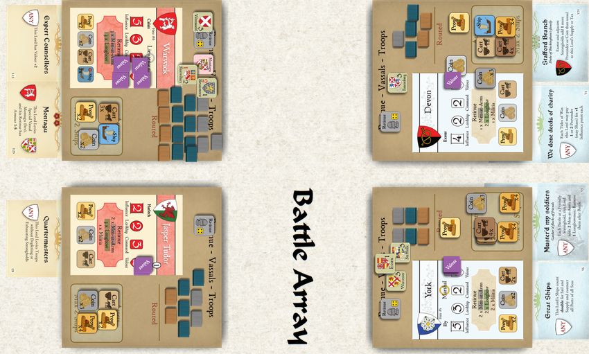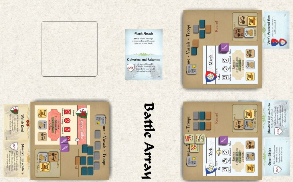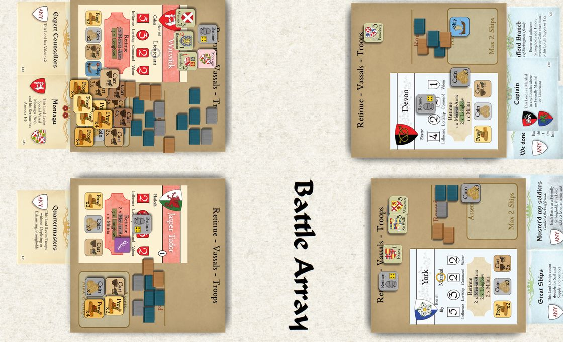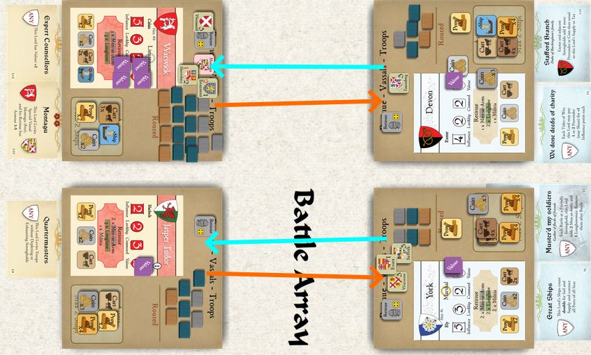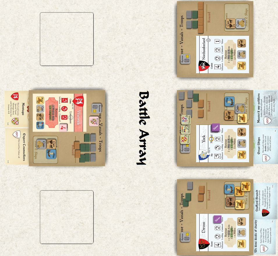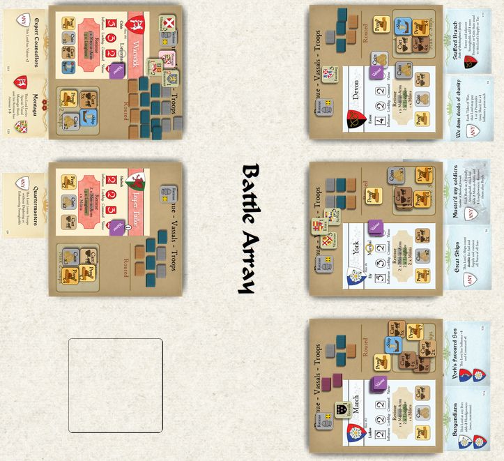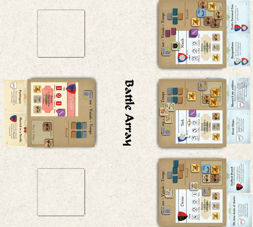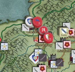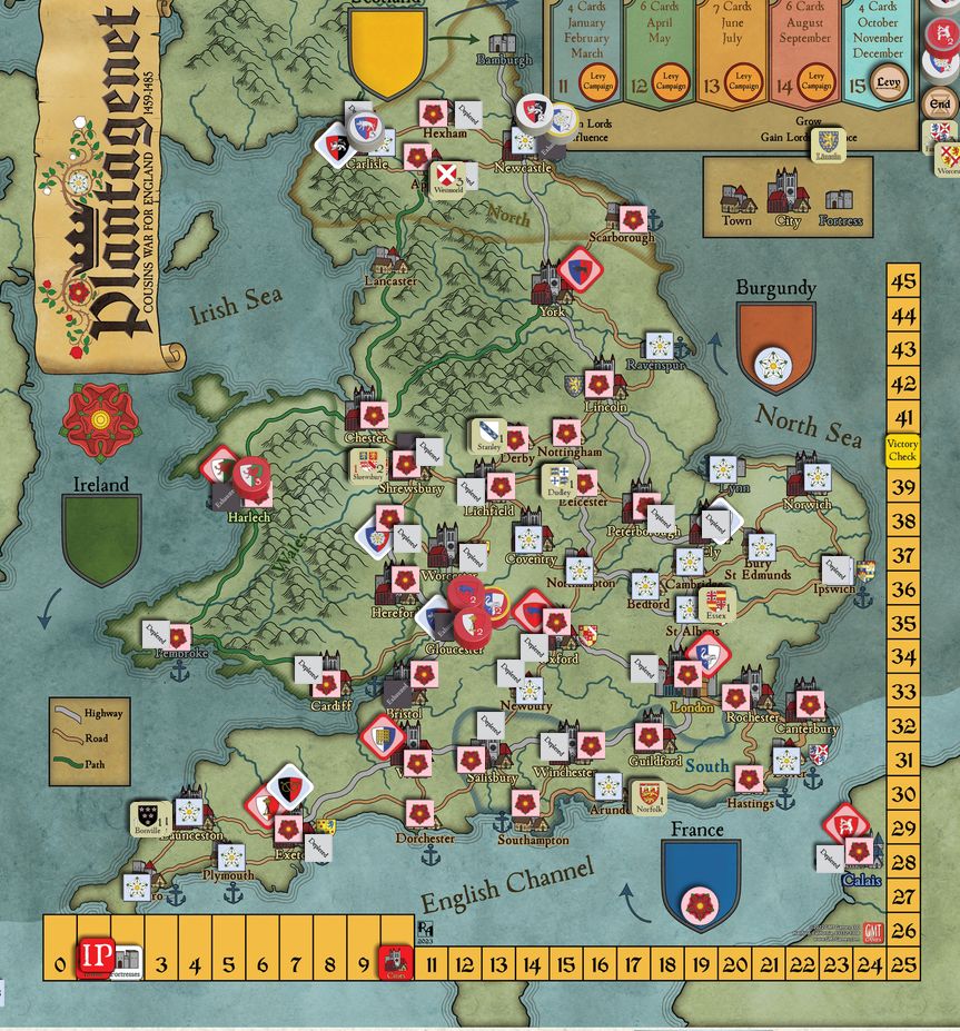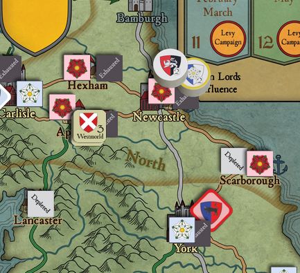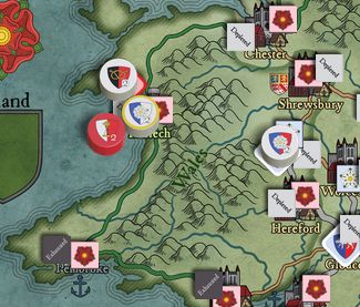 The other rule is that, because of personal feuds, Margaret and Warwick can never group with each other: after Margaret’s arrival, the Lancastrians will be much stronger than the Yorkists, but they will always be divided. That allows the Yorkists to use maneuver and smart placement of Lords to strike and defeat the Lancastrians piecemeal.