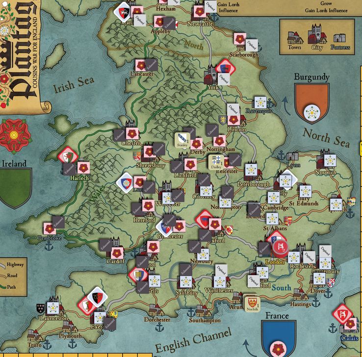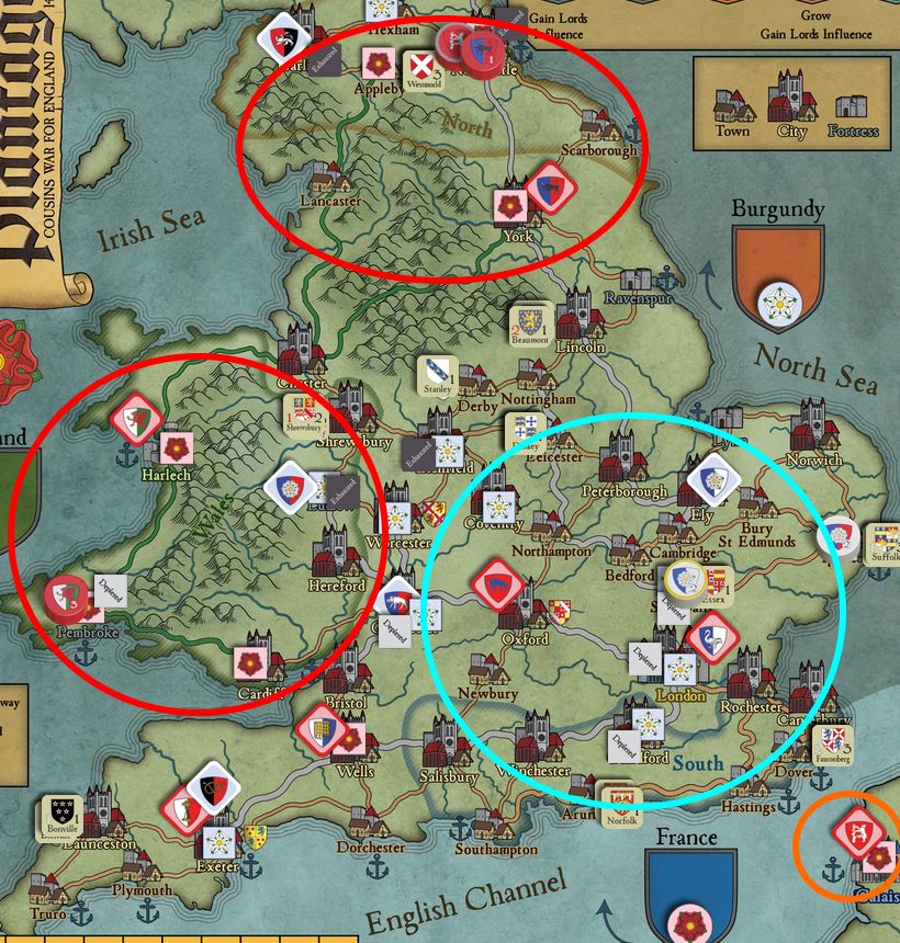 While the Yorkist have the military power in the early stages of this second part of the Wars of the Roses, the special rule noted earlier (that if Warwick is sent to Exile or killed as a defender, Margaret and her allies arrive earlier) makes it so the Lancastrians still have some leeway in terms of how they can shape Influence on the map.