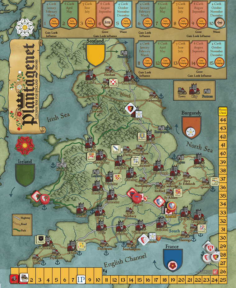 The strategy for each side is quite clear: the Lancastrians hold the center of the map and the London area, Warwick, militarily weaker but more mobile and more influential, will gather support from the strongholds all around England.