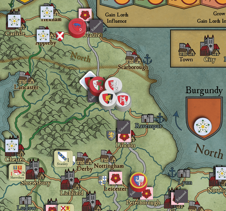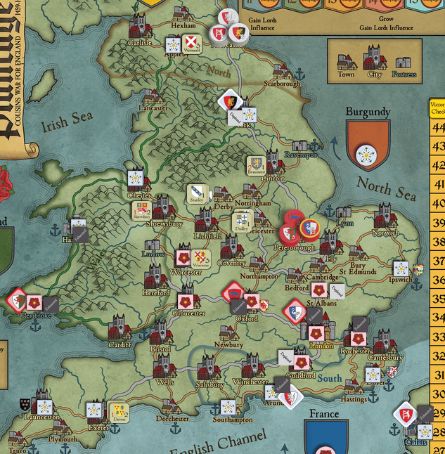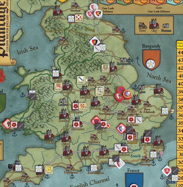 Influence points, in the first War, York at the top, and Lancaster at the bottom.