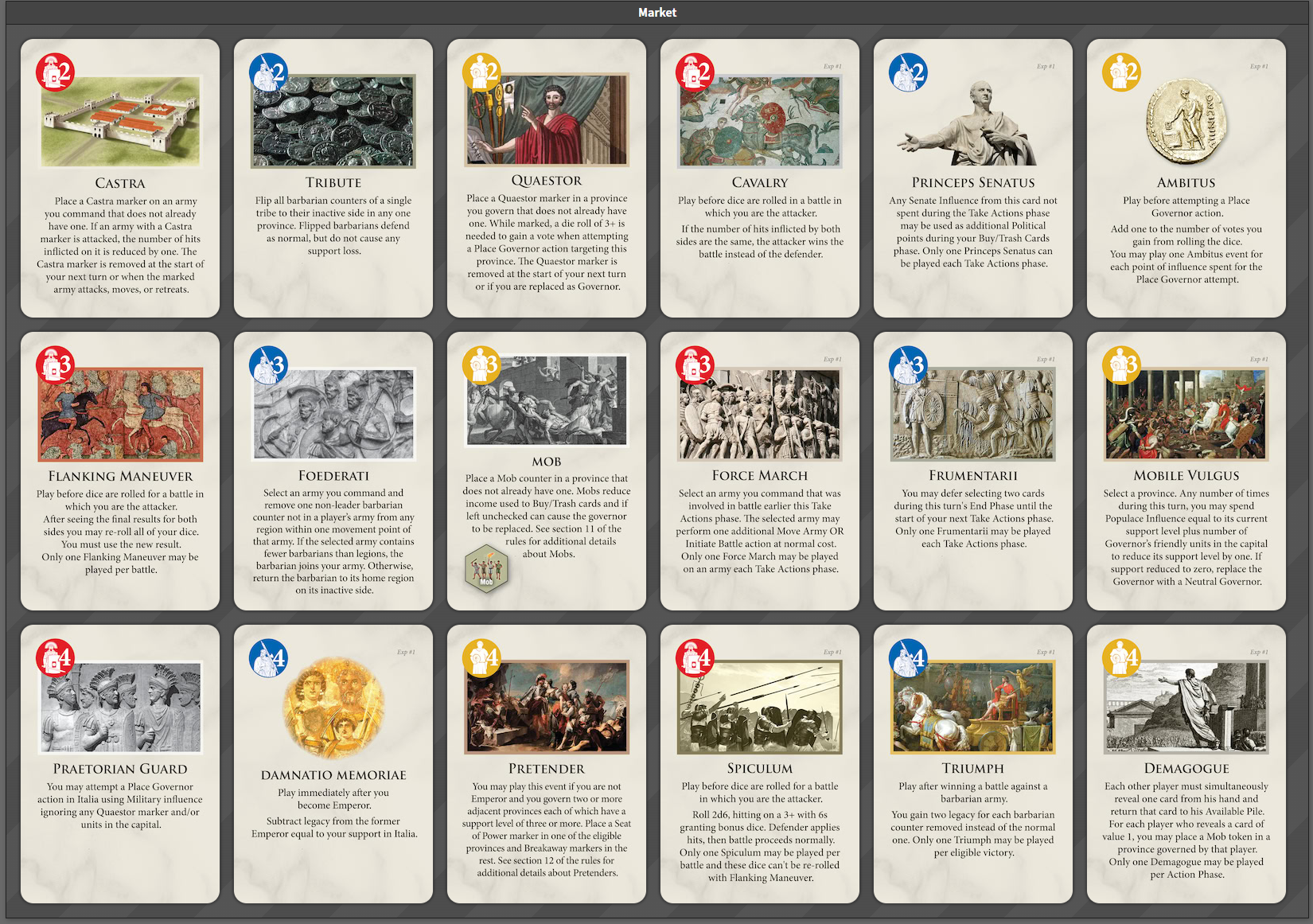 The game uses well-established deck-building mechanics, as well as a hand management. It covers all essential elements of the epoch: Praetorian Guard, civil wars, barbarian invasions, angry mobs, rival emperors, pretenders, etc.