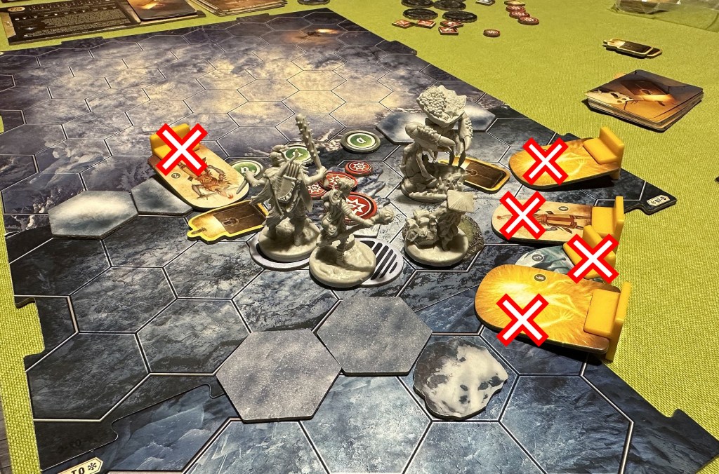 Still, there was some unfinished business to complete which we could not leave just like that. Namely, the retirement of Drifter. His personal goal was to collect some resources and then play two-scenario mini-campaign. We managed to accomplish the initial adventure – #69 Sacred Soil – and then our four-player team permanently collapsed to three.