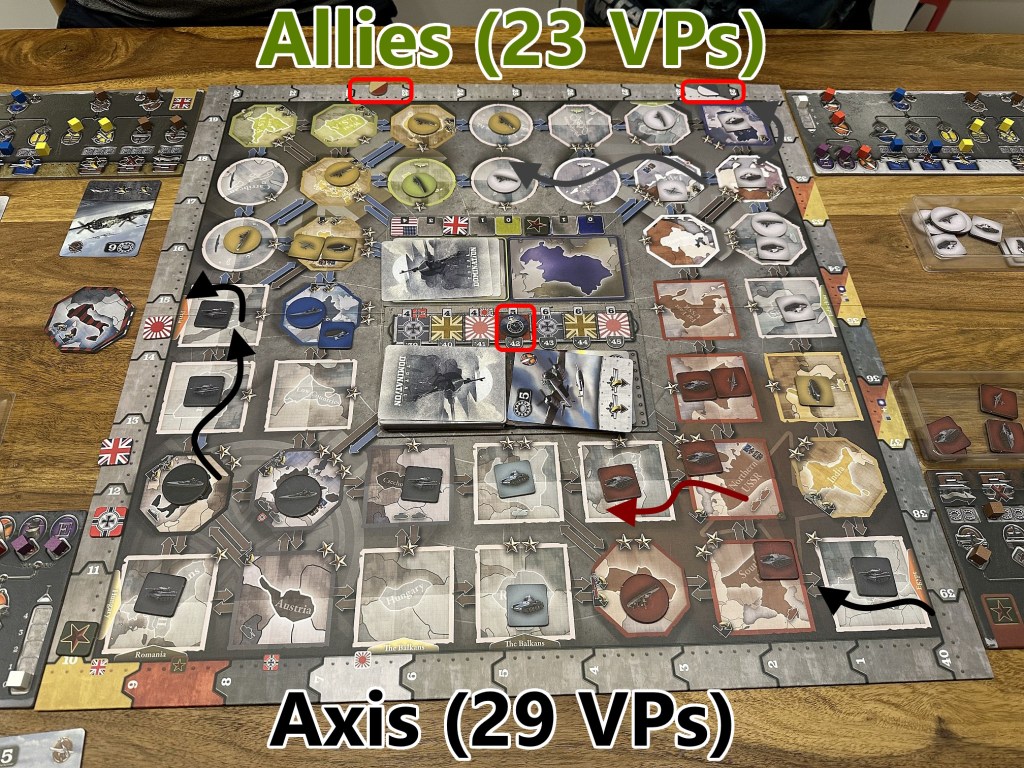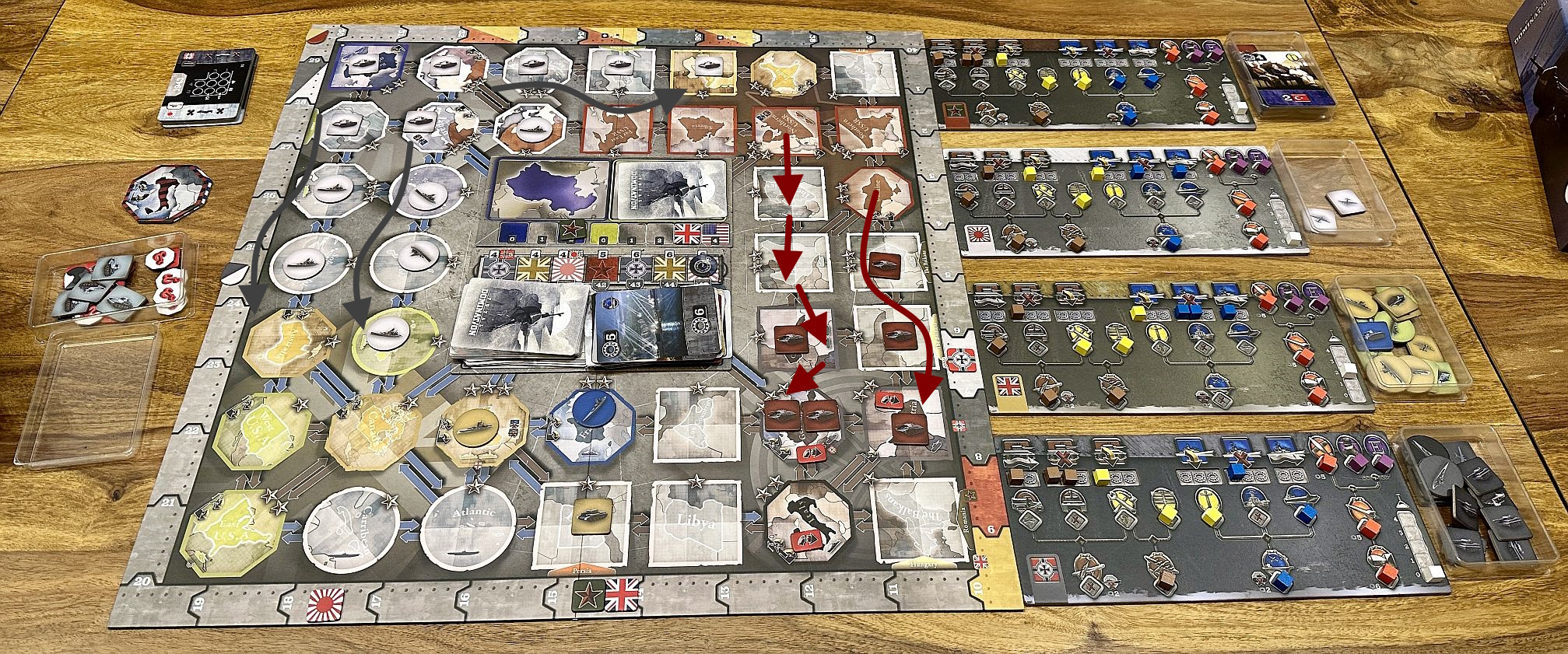 Allies equipped with the knowledge from the first game quickly invested in Land & Lease, bringing the US and China to the game pretty early. A lot of Air Fleets were used here, USSR invested heavily in land technologies (no more German attacks in Persia!), while Japan was crushed to a final unit at some moment in the game. Still, the result was in question till the final play of card by UK/US (they had to reach 39 points)!
