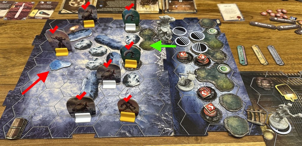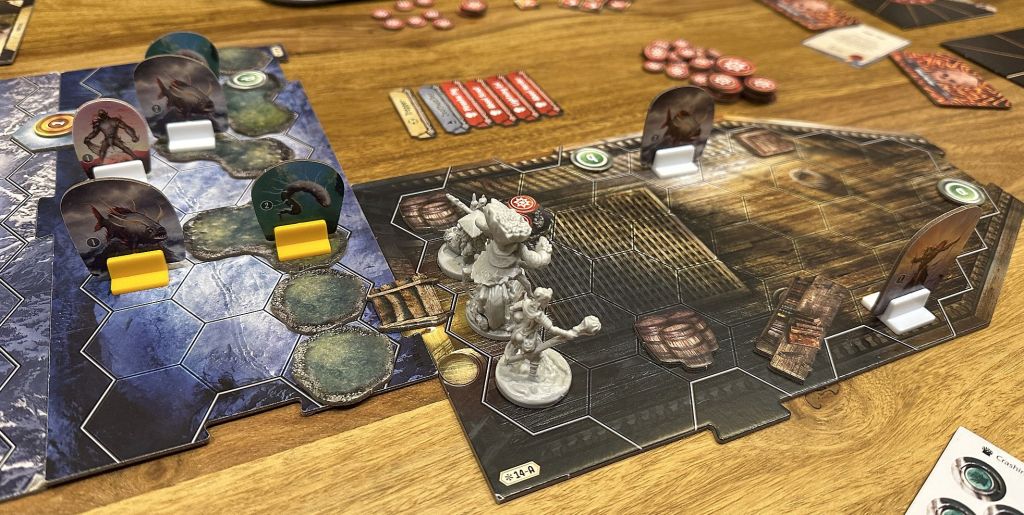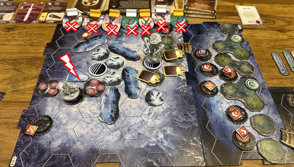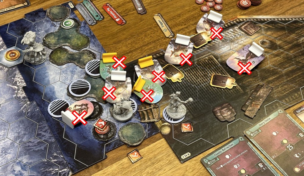 In Frosthaven some scenarios seem to require specific characters in the party, and some are almost completelly useless (like my Trap here- that was effective looter, but there wasn’t much else i could do, maybe killed 2 enemies, which isn’t great). Without Deathwalker’s teleportation system for allies Coral and my Trap would have huge problems to get through those eels(not too strong enemies, but block spaces and may stun in specific situations) and return to the starting tile(after we’ve spent lots of cards to clear initial enemies and destroy