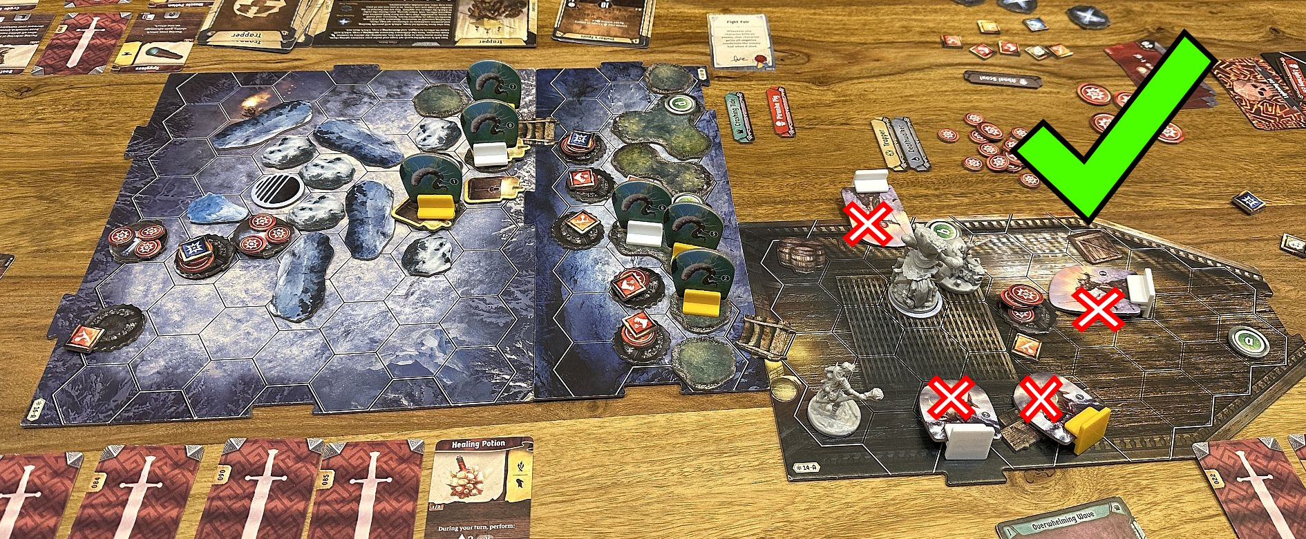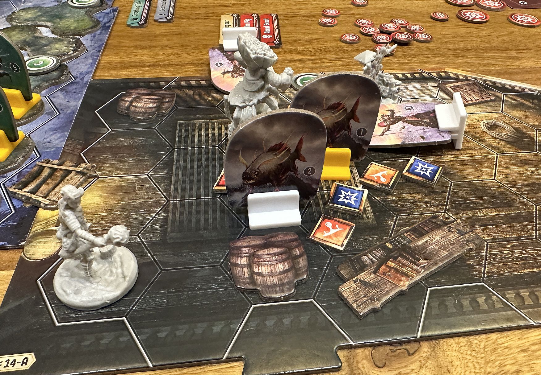 In Frosthaven some scenarios seem to require specific characters in the party, and some are almost completelly useless (like my Trap here- that was effective looter, but there wasn’t much else i could do, maybe killed 2 enemies, which isn’t great). Without Deathwalker’s teleportation system for allies Coral and my Trap would have huge problems to get through those eels(not too strong enemies, but block spaces and may stun in specific situations) and return to the starting tile(after we’ve spent lots of cards to clear initial enemies and destroy