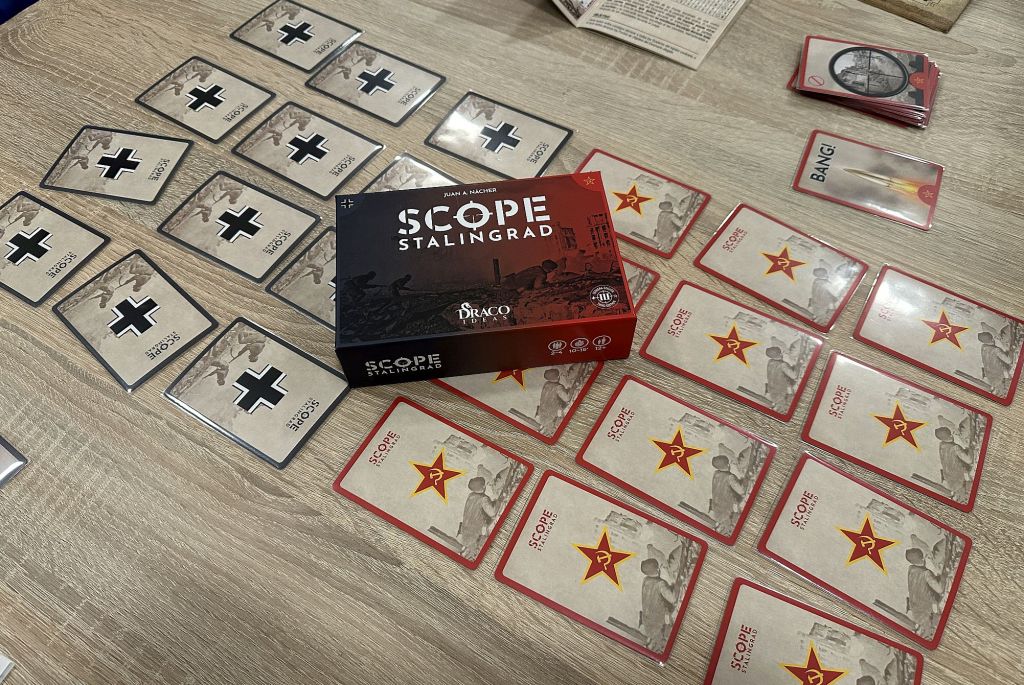 W momencie przerwy między posiłkami i ogólnego rozbiegania dzieci i dorosłych, wyciągnąłem grę SCOPE – a raczej trójpak gier, natomiast rozłożyliśmy tylko część pierwszą, Stalingrad. Ta szybka karciana gra wojenna – można spokojnie rozegrać w 5-15 minut – ma wiele trybów i zasady zaawansowane co pozwala zrobić z niej naprawdę dobrej klasy “wypełniacz czasu” między większymi pozycjami.