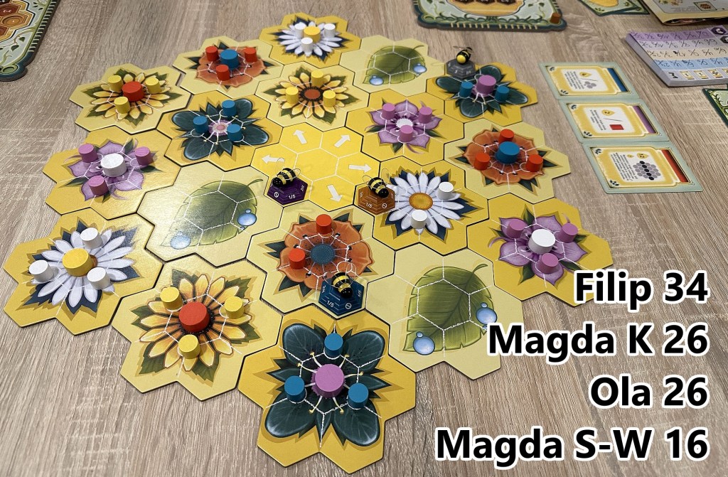 Gdy dzieci prawie już poszły spać (to prawie okazało się bardzo na miejscu jak później sprawdziliśmy) rozpoczęliśmy gry w gronie dorosłych. Rozpoczęliśmy od małej uroczystości (był jubilat, były prezenty, było sto lat i toasty!) A potem na dwa stoliki trafiły… dwie gry o pszczołach! Tak jakoś się zdarzyło…