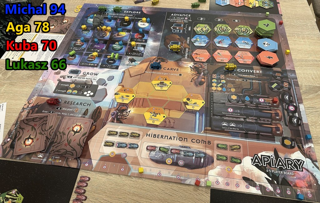 W tym czasie cały czas trwał pojedynek na stoliku obok. O Apiary (znanym również jako Pszczoły w Kosmosie) słyszałem dużo no bo to gra z mojej wyprawy z Kubą G. do Essen! Ten przesympatyczny worker placement, z pięknym wydaniem i licznymi opcjami na zwycięstwo, bardzo przypadł mi do gustu. Trochę wpływ na to miał na pewno fakt, iż udało mi się zoptymalizować strategie mojego roju i zgarnąć największa liczbę punktów zwycięstwa.