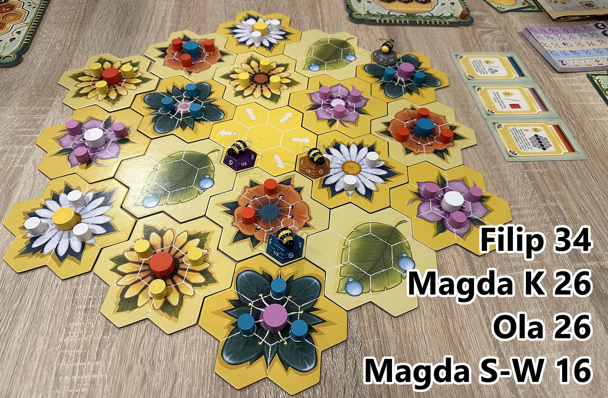 Gra Beez jest w naszym parku gier od dwóch lat, ale chyba po raz pierwszy zabraliśmy ją aby pokazać większej publice. Ten szybki tytuł, gdzie głównym celem jest stworzenie miodu, wygląda prześlicznie i daje się zagrać spokojnie w 45 minut. W tym wypadku Fili, nowicjusz w tą grę, zdecydowanie zdominował rozgrywkę!