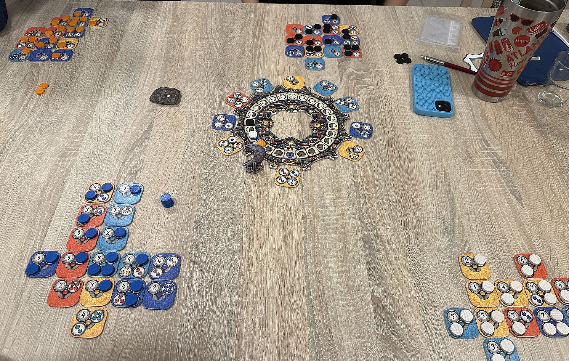 Nova Luna to już klasyk w naszym towarzystwie – i zdecydowanie jedna z najbardziej lubianych gier planszowych. Ta logiczna łamigłówka Uwe Rosenberga ma coś w sobie, że chce się do niej powracać i powracać. Jako, że drugi stolik pszczeli jeszcze grał, a Beez skończył się dosyć szybko, Magda SW, Magda K, Ola i Filip zagrali szybką partyjkę (nomen omen, w prezent naszego jubilata!) Ponownie najlepszy okazał się Filip, zdecydowanie pokonując resztę towarzystwa.