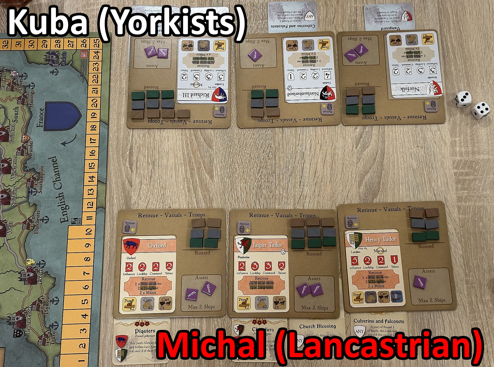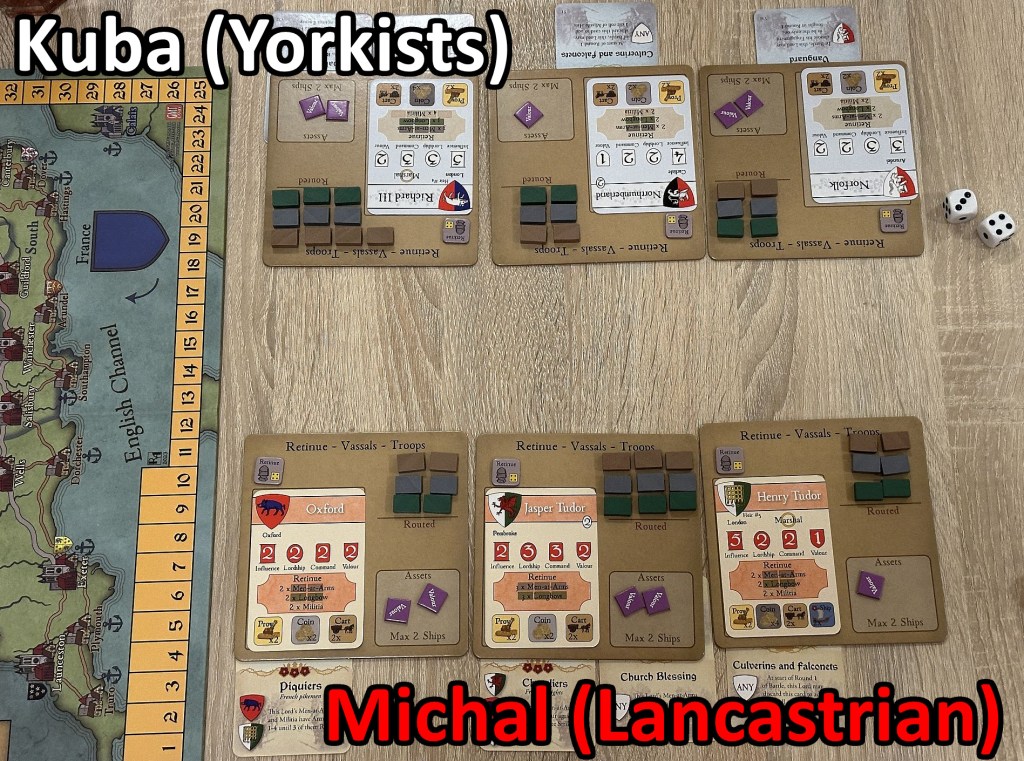 No cóż, wyszło nam dosyć historycznie i moi Lancasterowie pod dowództwem dwóch Tudorów pokonali króla Ryszarda III, prowadzonego przez Kubę. Scenariusz pokazał jak kluczowe są karty capabilities obu stron i miał na celu zapoznanie z mechaniką bitwy. Dłużysz scenariusz już wkrótce!