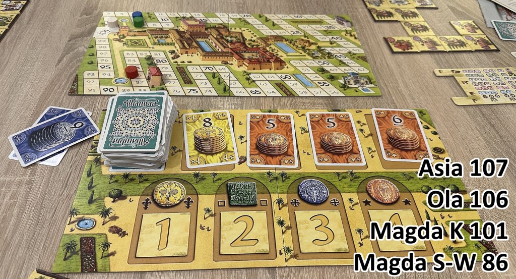 Szybka, miła i przyjemna – do zagrania zarówno przez dorosłych jak i dzieci – to dokładnie Alhambra. Idealnie pasuje na wprowadzanie nowych adeptów do naszego hobby. Dwóch dorosłych (Magda & Magda) plus dwójka dzieci (Ola & Asia) miały dużo radości z ciekawej rozgrywki, a ostatecznym zwycięzcą została Asia!