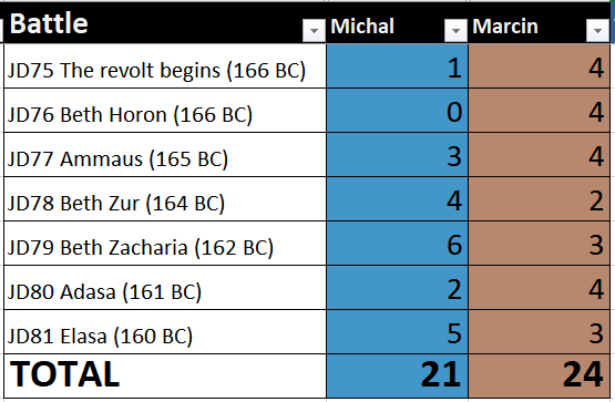 Played out the campaign of 7 games in one Friday evening. 28-10 to the Hasmoneans with the Seleucids having disastrous malfunctions at both Beth Zacharia and Elasa.