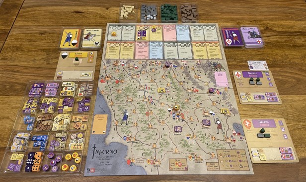 What I appreciate is that each volume in the series features widely different geographic, cultural, and political settings, each with twists on the core rules to help bring out these differences. Inferno focuses on fighting between the Guelph and Ghibelline political factions in the well-developed and densely populated Tuscany of the mid-1200s. All of this beautifully presented with top-notch components!