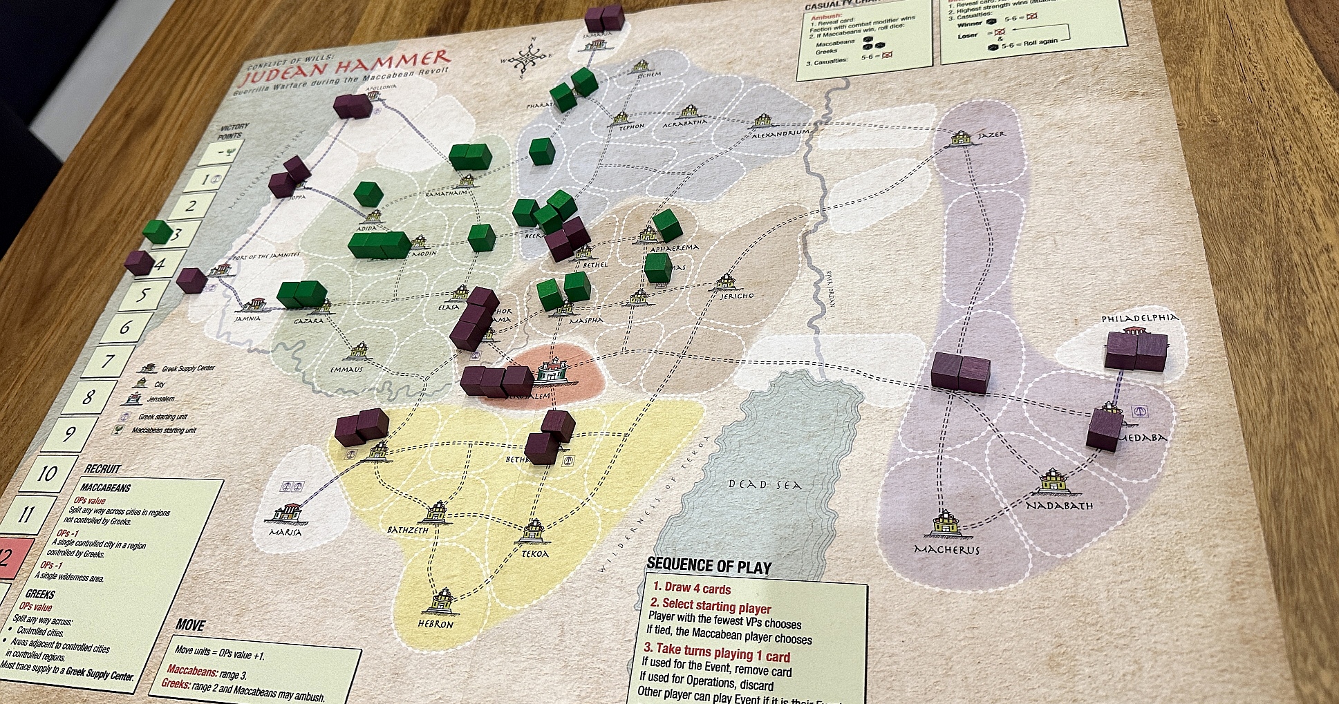 Let me give you some words of introduction. Judean Hammer is a truly fast-playing wargame which depicts tense struggle between the rebel player (The Maccabeans) and the empire player (The Seleucid Greeks) trying to re-assert their control. This two-player wargame plays in about an hour, with a lightning-fast set-up time. The Greeks start in their unassailable supply centers, controlling Jerusalem, but the Maccabeans can use ambushes to whittle their foe while cutting off the Greek supply.
