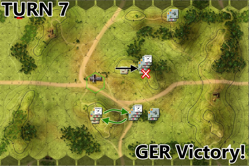 - One of the sides sustained enough losses to reach its Casualty Limit (here it was only one for US and three for Germans). The other side wins.