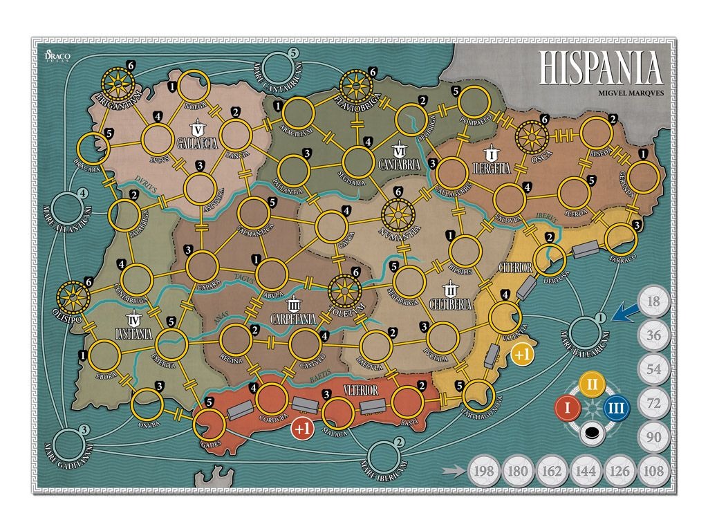 Miguel: You must have recognized the main abstract mechanics: point-to-point movement, generic meeples and discs, action points, Roman/Barbarian dice to govern combat and the AI behavior, huge difficulty table… However, what in Tetrarchia felt like an agonic defense against unexpected attacks, in Hispania had to feel like a daring penetration into hostile territory. I introduced sieges, removed unrest pieces, allowed for multiple discs per city, added coins to combat and to the difficulty table, changed the AI behavior of armies, complemented movement with sea links and Roman roads… As a result, despite the more uniform game area, the game has become more dynamic and strategic. And most importantly, it feels like the Roman conquest!