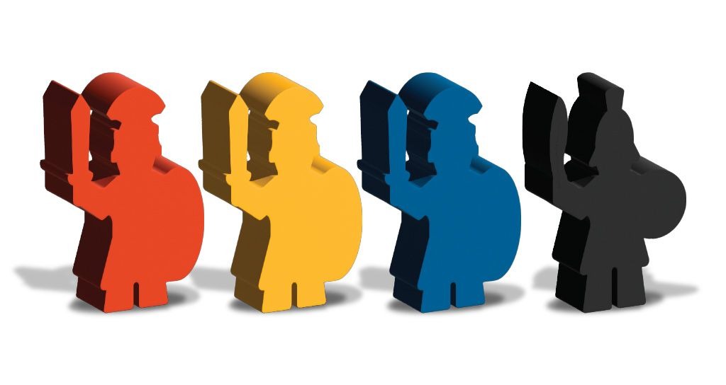 Miguel: The game is cooperative, and can be played by 1 to 3 players using exactly the same rules (there are always two praetors and one consul in play), so it can be considered solitaire too. There are only two types of pieces, wooden discs and meeples, the colored ones represent the Roman garrisons and generals and the black ones the revolts and Hispanic armies that need to be subdued.