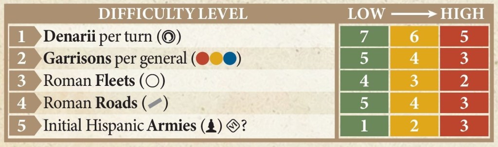 The rules are simple, with only a few basic actions available, but the combat system requires close cooperation that leads to many different combinations. The whole game is governed by a couple of dice, one Roman and one Hispanic, that determine combat, the arrival of revolts and armies, and the movement of those armies. Finally, 5 setup parameters can take 3 values each, leading thus to 243 (35) difficulty levels!