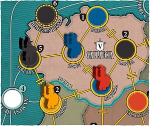 The combat mechanic is the main ingredient that leads to strategy. When two armies battle, the roll of the Roman and Hispanic dice determines the winner… but there are modifiers! First, each army adds to its roll the number of own discs connected to it, which forces the Romans to think about where and when to deploy their garrisons while trying to reduce the revolt base of the opposing army, or at least cut it from its base. Then, the Romans can add up to 3 coins to their roll. Finally, if allied armies are connected to the enemy the corresponding value is multiplied x2, which requires careful planning and timing. The net result is that players that don’t cooperate will spend most of their coins fighting, and will not have time for other actions. Close cooperation will win battles without overspending your energy.