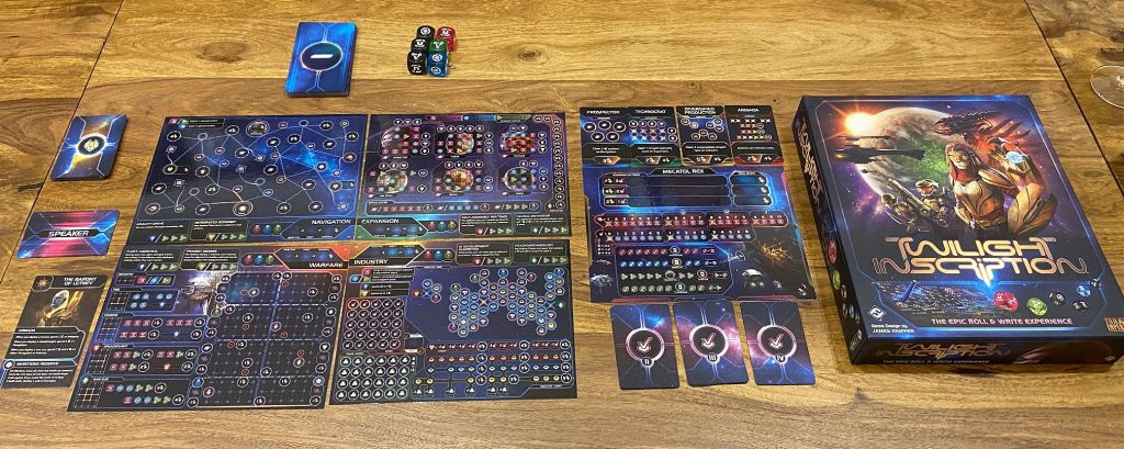 I admit, playing Twilight Inscription was a huge fun. It is really interesting write & role game, with a lot of planning and empire building; still, negative interaction is important too, as war wage across the common deck of events – unlike some other titles in this genre, you cannot ignore what are your neighbors are doing on their player mats 🙂