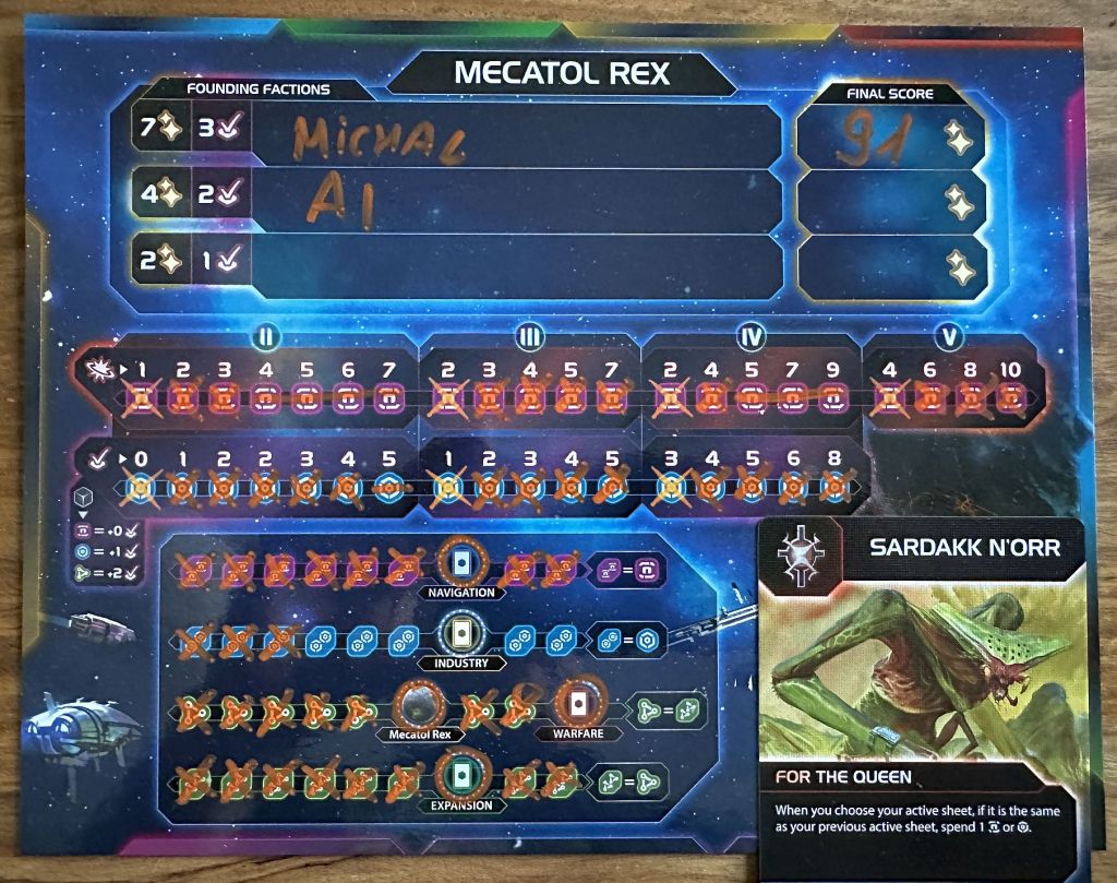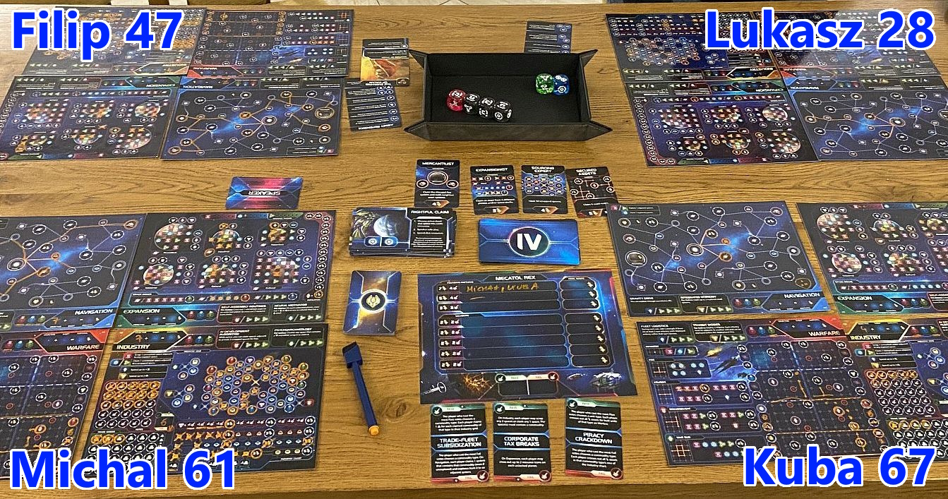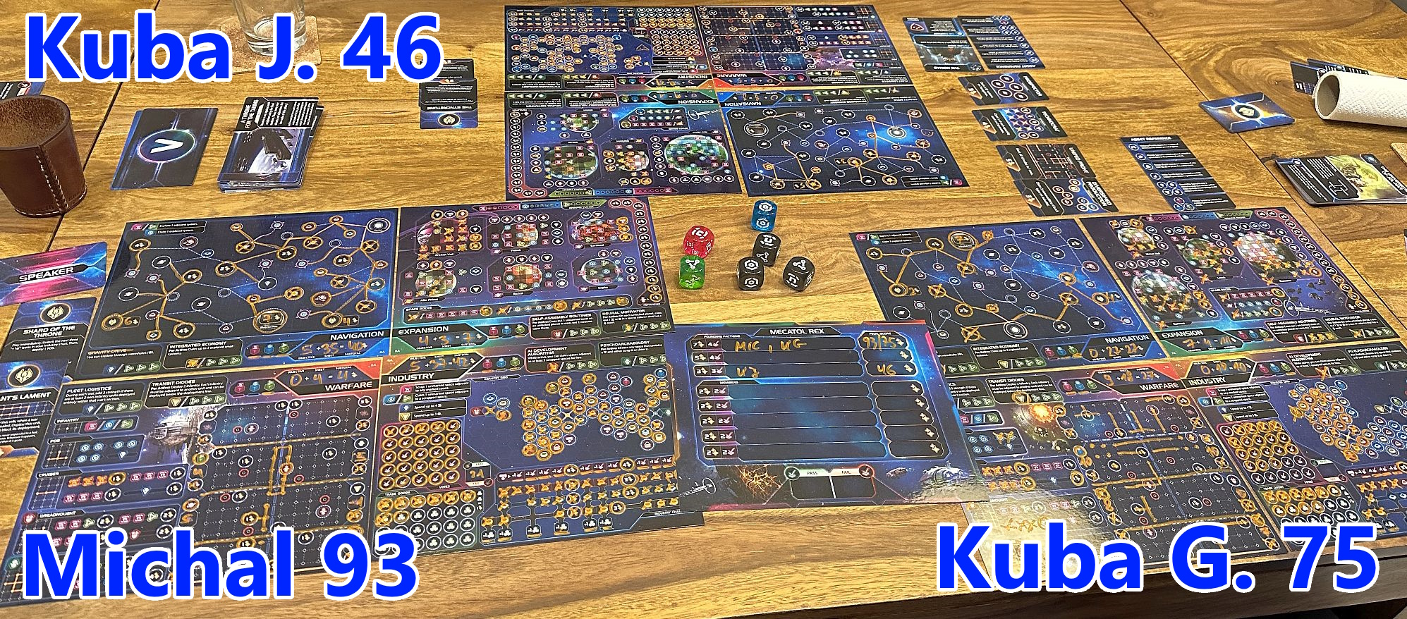 What I really like about that game is that our second attempt – although with one new player (Kuba J.) was much quicker, straightforward and simply smooth. Decision paralysis was more or less gone, the choices and strategies clear – to large extent driven by the objectives, faction cards as well as dice rolls. We even played another roll & write game during this evening!