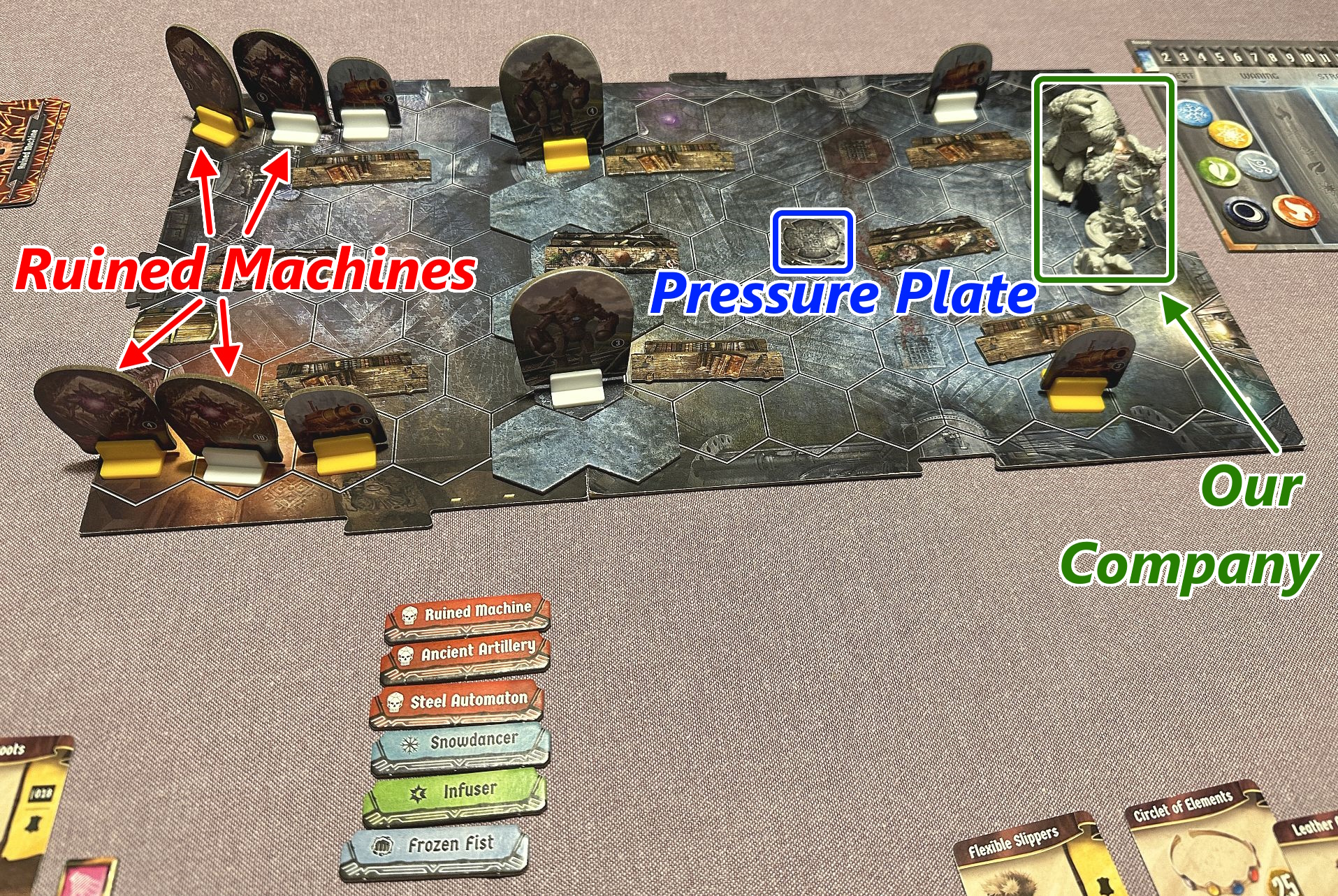 With two dots that should be semi-complex scenario; it has one room, all monsters (hopefully) visible from the onset. However, there is a trick. A special Pressure Plate in the center of the room which if occupied by any figure – even us – ends the scenario as failure for us. What is more, all the Ruined Machines will focus on it and try to get there, ignoring us! Well, we will need to channel them somehow…