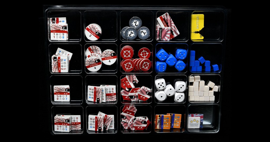 That Pacific War theater game is not so counter-intensive like other titles covering that topic but still, two large, deep trays are full of US, Allied and Japanese ships, planes and armies. It give me a lot of pleasure designing that particular solution as components are beautiful and it was simply fun. Enjoy the set!