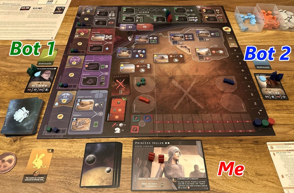 Having the knowledge of the game based on the multiplayer plays and having such a good experiences with it, I pretty quickly jumped to the solo mode. That one is pretty straightforward. It uses various difficulty rivals (mimicking actual Leaders from the game) as well as Deck of Cards driving the game (so called House Hagal deck). You can play 1 vs 2 (you versus two bots) or with colleague versus 1 bot. In each case, it is everybody for himself of course.